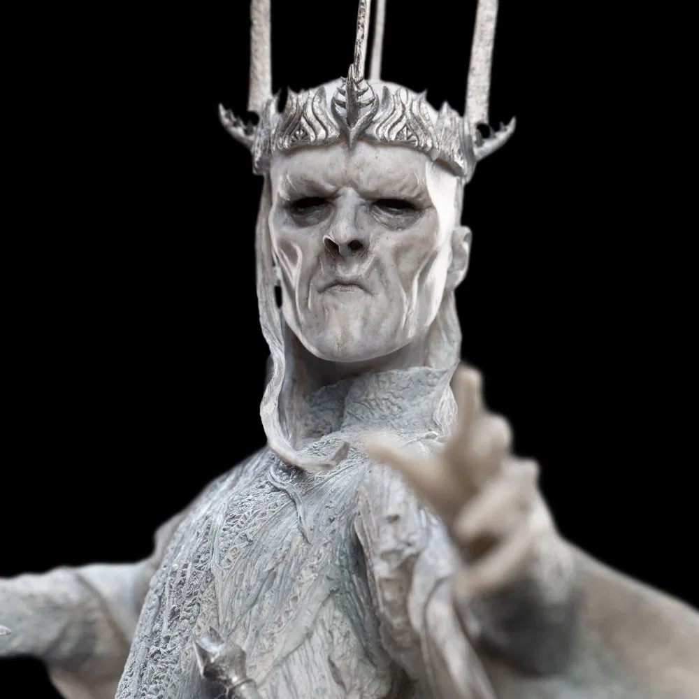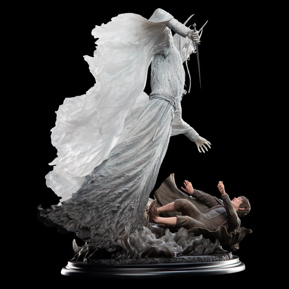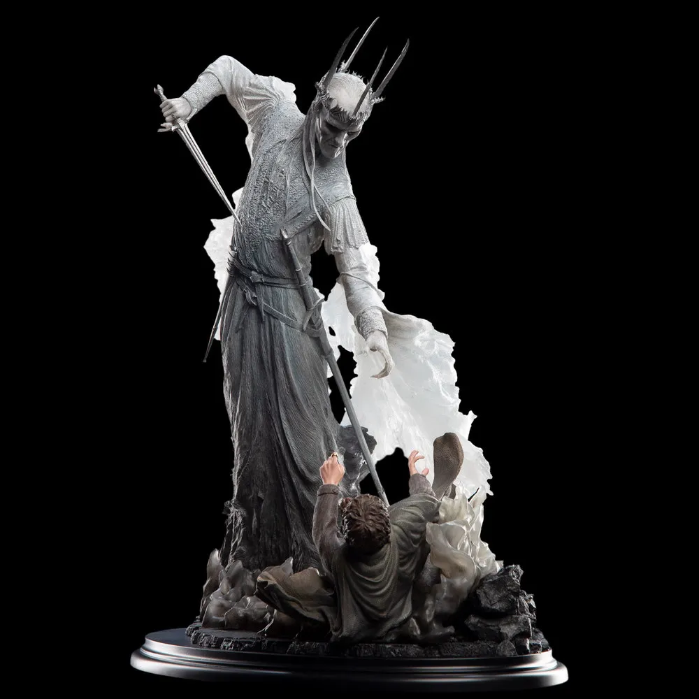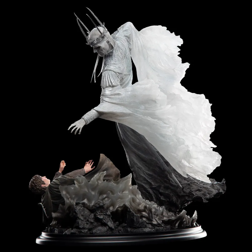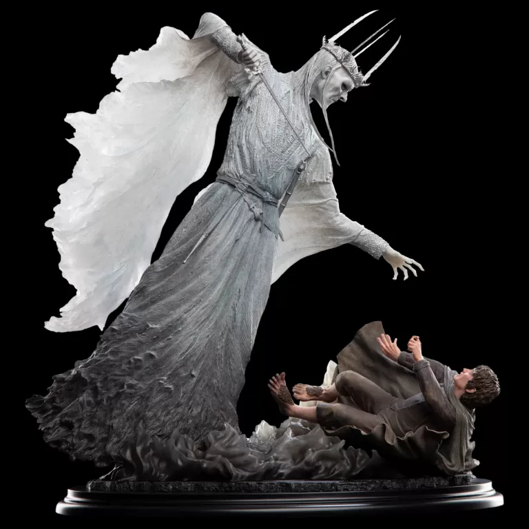 Unable to resist, Frodo thrusts the One Ring onto his finger and is plunged into the grey spirit world of Ring-sight. No longer an empty black robe, the Witch-King is revealed to Frodo in his true form, fell and terrible to behold. Beneath a bladed crown he glows with an unearthly light; a tall white being of ghostly skin drawn about sunken features, wispy hair whipped by an ethereal tempest, and a long, jagged blade in his luminous hand as he reaches for the Ring. Elements whipped & distorted by Wraith-world effects create the sense the Witch-King is in a different elemental space, distanced from the Hobbit – prototype sculpted by Jane Wenley. Made from high-quality polystone with environmental resin. Captures a critical moment in Tolkien’s story, where we almost lose our hero.