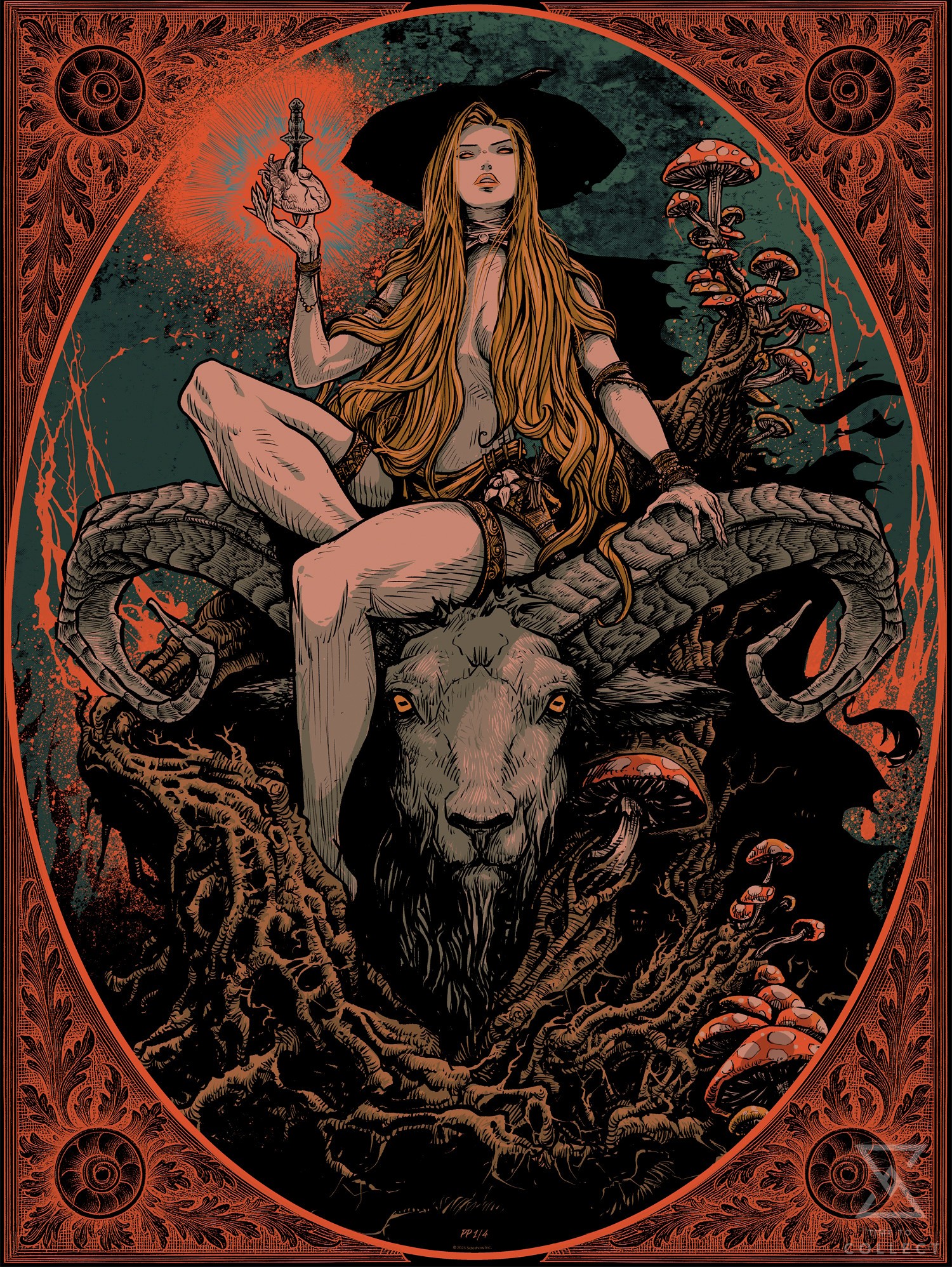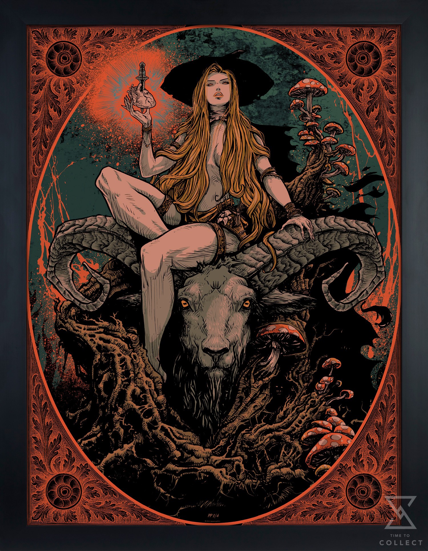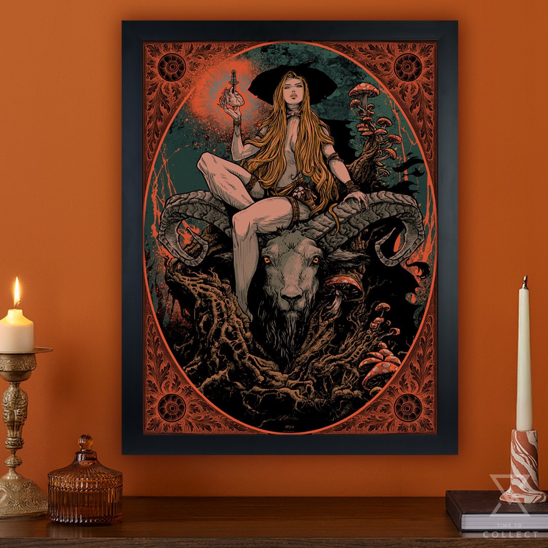 Danger dances in the forest, where a bedeviled beauty beckons unsuspecting travelers into the shadows. The Witch of the Woods wears a black pointed hat and little else, her enchanting exterior hiding the darkness within. This stylish portrait shows the sorceress surrounded by toxic toadstools and gnarled tree roots in her woodland domain. Beneath her, a giant goat with curved horns emerges from realms unseen and carrying an air of black magic to it. The witch holds a heart in her hand, its delicate pink sinew pierced by a silver dagger – is this the price for her ageless beauty? Few survive to share the harrowing truth.