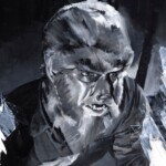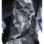 Beneath the fur and fangs, actor Lon Chaney Jr. treads the line between humanity and animality as the title character in the 1941 Universal Pictures film The Wolf Man. This monochromatic portrait of a man transformed captures the lycanthropic curse on Larry Talbot, burdening him with all the harsh qualities of a beast. Valentine’s brush strokes and layering of light and shadow spotlight the character in a way that recalls the tradition of black and white filmmaking.