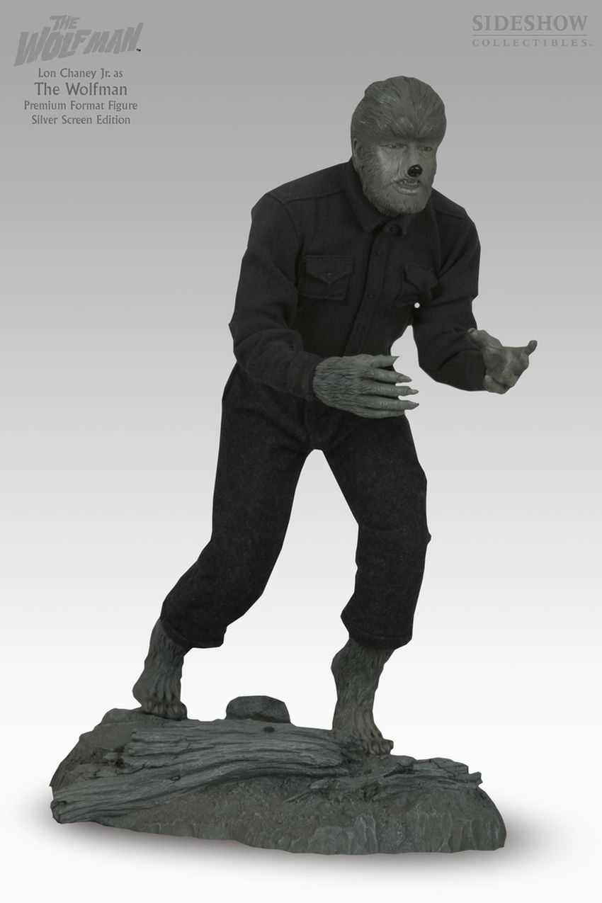 Based on the film The Wolf Man, released in 1941, this 1/4 scale figure captures Lon Chaney Jr. in one of the most iconic roles played in his illustrious 172 film career. Sure to be the centerpiece of any Wolf fan’s collection, this mixed media figure combines a hand cast and hand painted polystone body with expertly tailored clothing, capturing the Wolf Man as he bears his ferocious claws and teeth. The figure stands approximately 16.50” in height on a detailed forest-floor polystone base.