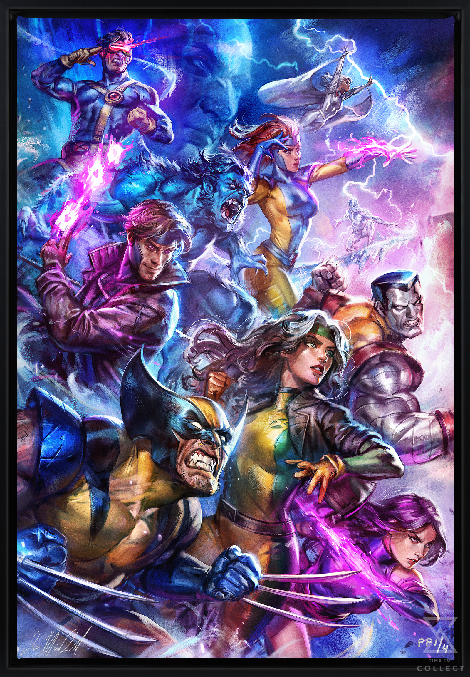 Inspired by decades of X-Men comics, this super hero art is available as an unframed giclée print or in a custom framed presentation. Each X-Men Fine Art Print features an authorized, automated artist signature and an embossed Seal of Authenticity as part of the limited edition of 350. For an even more epic wall display, pair the X-Men Fine Art Print with The Brotherhood of Mutants Fine Art Print by Ian MacDonald — sold separately.