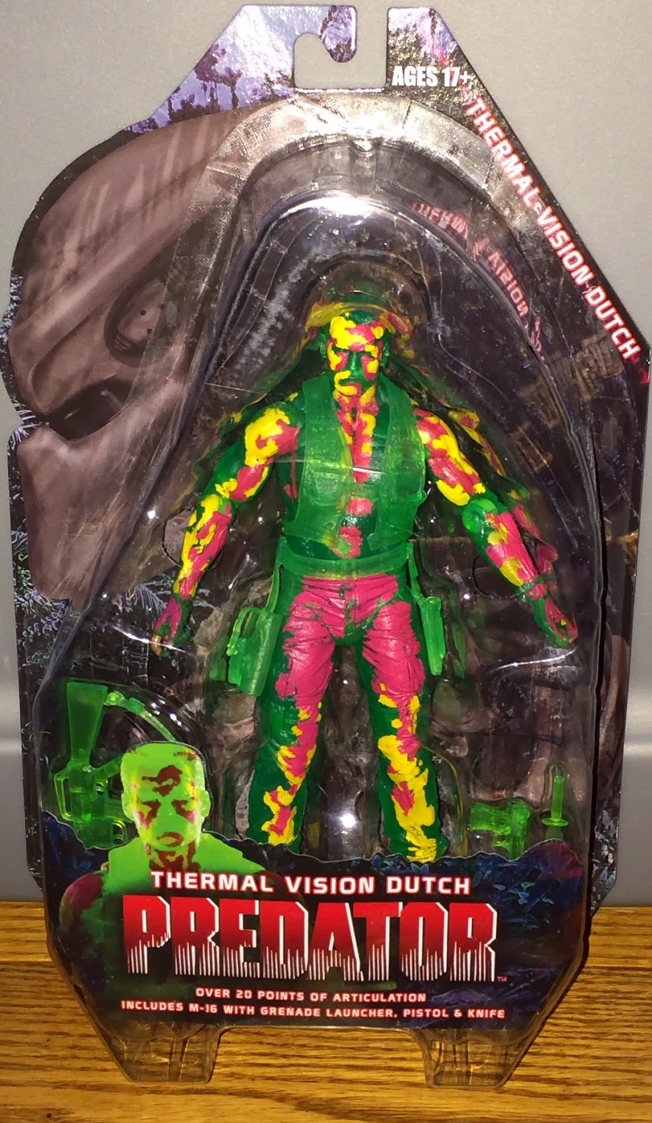 Shown at SDCC 2013: Thermal Vision Dutch! This special version of Dutch authentically replicates how the Predator sees him using his heat vision. The figure is cast in translucent green and is painted with “hot spots” of yellow and red. Comes complete with rifle, pistol, and knife accessories. Now as Gernal Blister at Series 11.