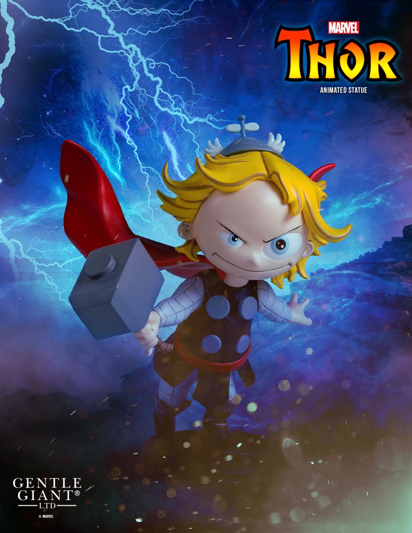 Odin’s beard!! Gentle Giant Ltd.’s animated Marvel statue line expands into Asgard! The Mighty Thor becomes the 11th character in our popular and adorable Marvel animated statue line. With his beanie propeller helmet, flowing cape, and wielding Mjölnir, this tiny god of thunder is rushing into action alongside his Avengers teammates! The Thor Animated Statue was digitally sculpted and carefully printed on state of the art 3D Systems 3D printers. The high-resolution prints were then used in the creation of prototypes needed to produce this animated collectible. Each animated statue is hand-cast, hand-painted, and hand-numbered with a limited edition certificate of authenticity.