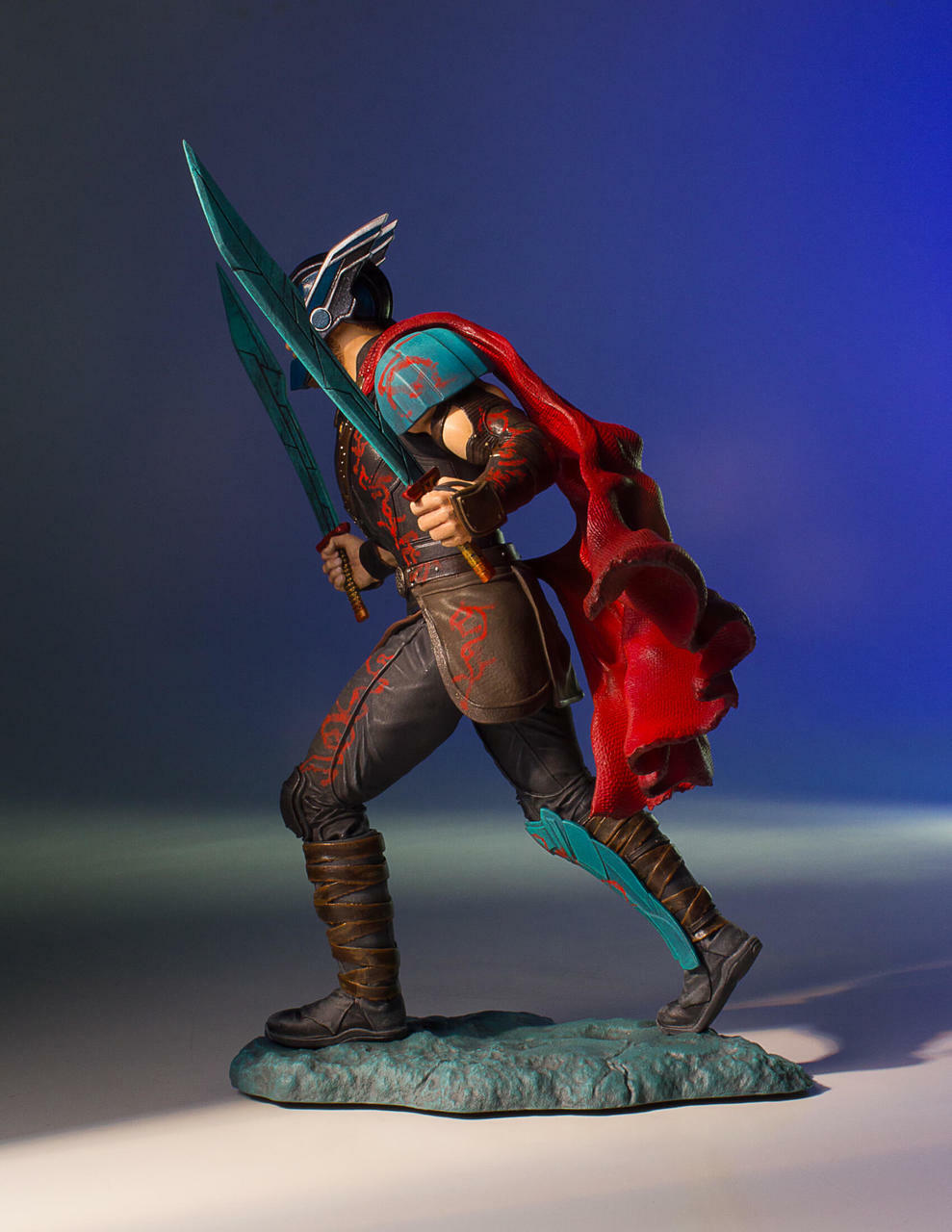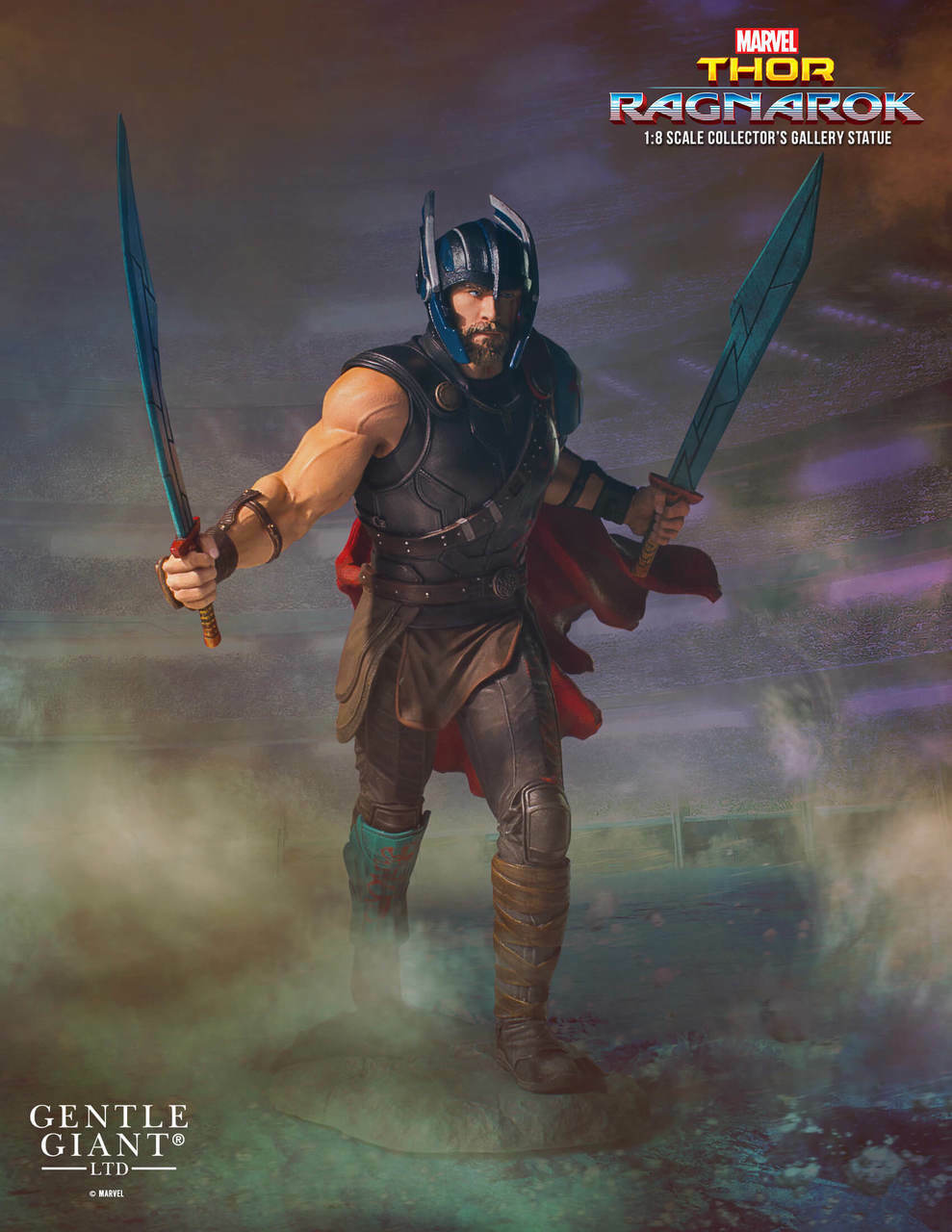 Imprisoned on the other side of the universe, the mighty Thor finds himself in a deadly gladiatorial contest that pits him against his former ally and Avengers team-member the Hulk! Thor finds himself without his hammer or his powers and a pawn of the Grandmaster and his games. Thor’s quest for survival leads him in a race against time to prevent the all-powerful Hela from destroying all of Asguard. Straight from his silver-screen appearance in the upcoming Thor: Ragnarok feature film, the Thor Collector’s Gallery Statue has been digitally sculpted down the minutest detail, and hand-painted by the amazing artisans of Gentle Giant Studios. Thor is decked out in his gladiator arena armor with his helmet, cape and double swords and features a stunning likeness to actor Chris Hemsworth. This 1:8 scale statue of Thor is the 6th in our Marvel Collector’s Gallery statue line. You can display this piece on its own or with our upcoming gladiator Hulk Collector’s Gallery statue. The statue comes with a hand numbered with certificate of authenticity.