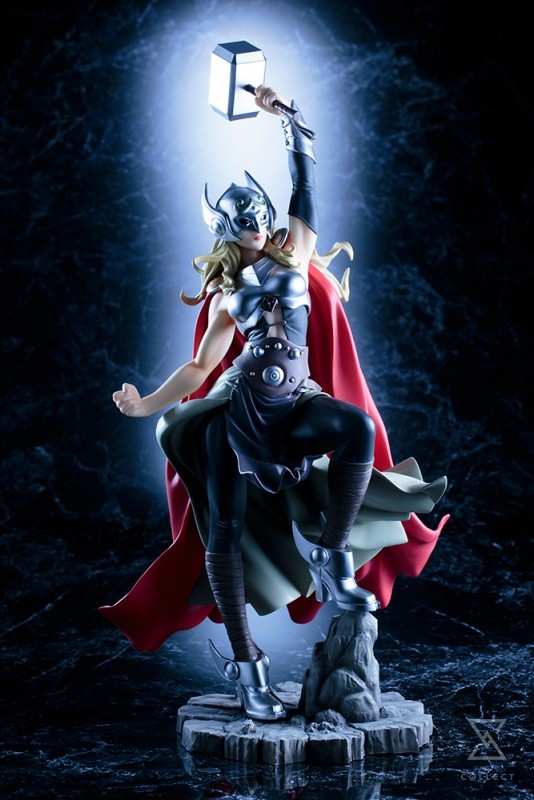 A Kotobukiya Japanese import! The Marvel Bishoujo collection brings you new interpretations of familiar superheroes and villains, and the latest addition to the line summons a character who’s recently undergone quite a change in the pages of Marvel Comics, Thor! After Odinson was deemed unworthy to wield the magical hammer Mjolnir it passed on and suddenly there was a new heroine on the scene. Instantly popular with the fans, this feminine version of the iconic Asgardian deity was a mystery for months until it was revealed that she’s really Jane Foster, longtime friend of the original hero! Now the Goddess of Thunder comes to you in an incredible Bishoujo Statue presentation based on a new character interpretation by Japanese illustrator Shunya Yamashita.