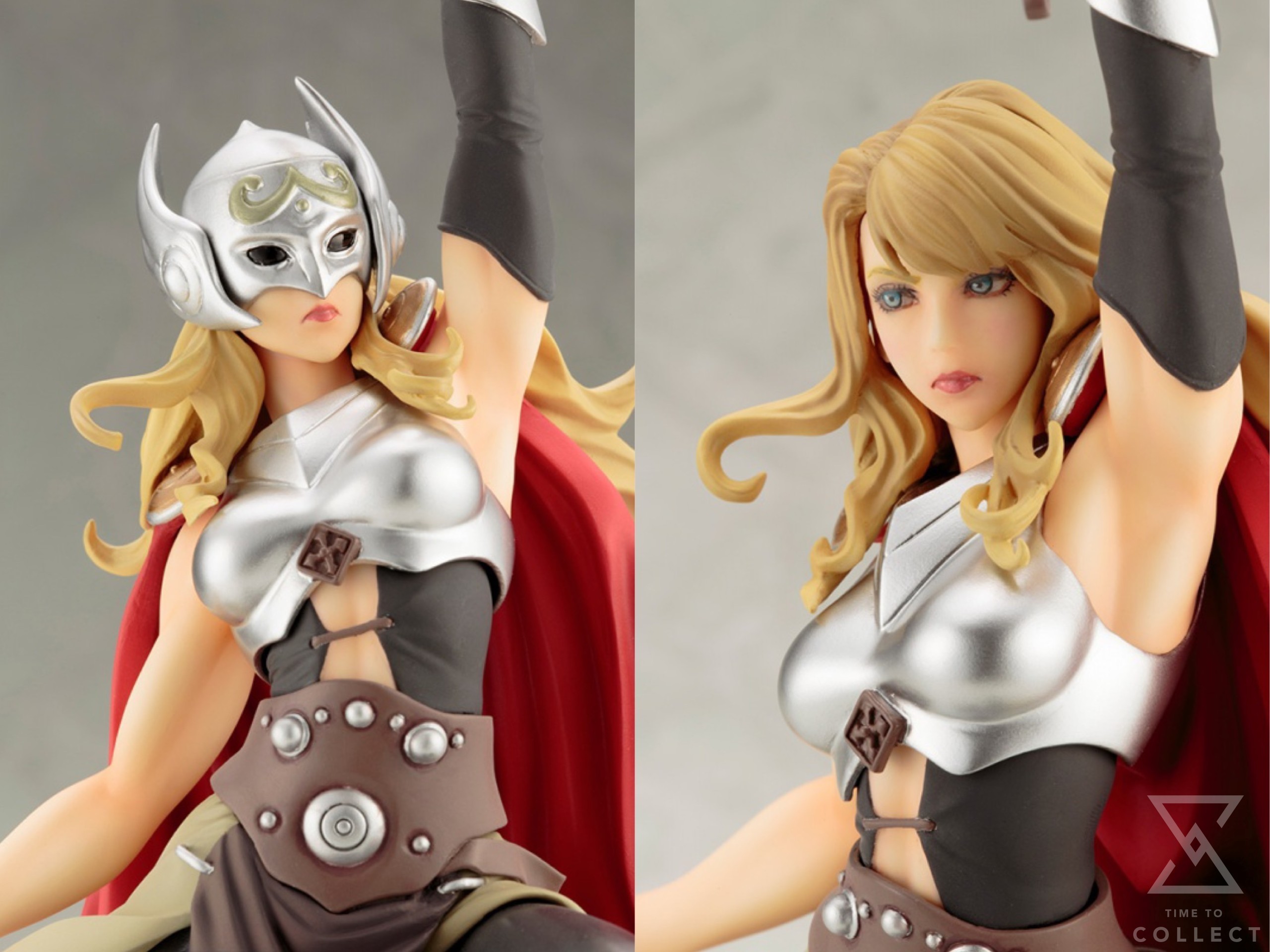 Thor is here to summon the lightning in a fierce pose that has her holding Mjolnir aloft! The empowered Jane Foster wears a fabulous Asgardian outfit with black leggings, silver winged boots with lower leg wraps, multiple skirts in different colors, a wide leather belt with silver accents, a silver breastplate, and a long red cape. Her garments are intricately detailed with various clothing elements as well as motion from an unseen wind. Meanwhile, Thor’s mighty hammer gleams in her outstretched hand. The heroine comes with two different, interchangeable portraits so you can display her with her distinctive helmet or without it so her Bishoujo-styled face and long blonde hair are in full effect!