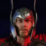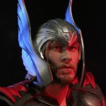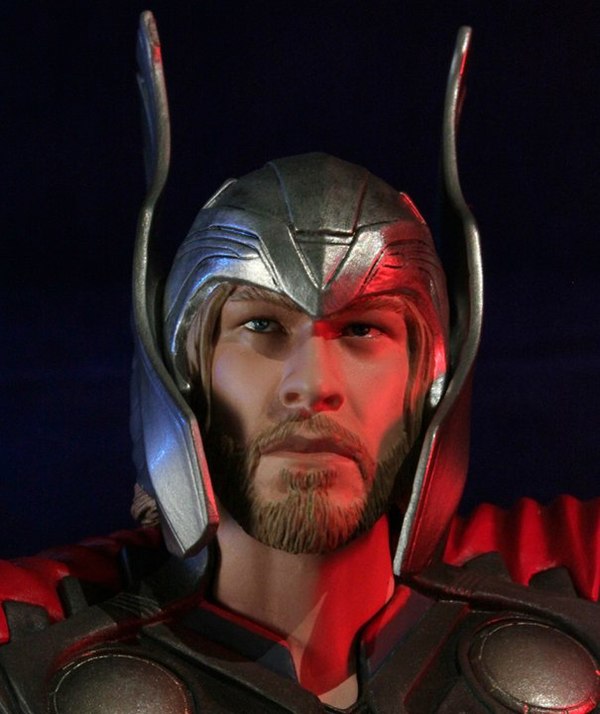 The film accurate Norse god raises his Mjolnir Hammer high and ready to take on all challengers.