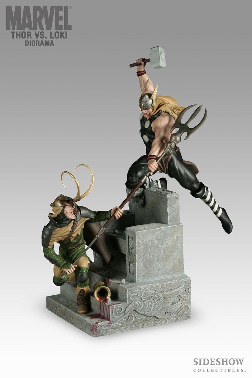 Behold! The noble mortals at Sideshow Collectibles and Marvel Comics are honored to present one of the oldest and most celebrated conflicts in all of comic history. The Thor vs Loki diorama recreates the artwork and style from the Loki tale, as imagined by Esad Ribic, with the two foes captured the heat of battle. The Thor vs Loki diorama is cast in heavy-weight, high-quality polystone, then hand-finished and hand-painted to exacting standards. Each piece is individually hand-numbered, then packaged in a durable foam shipping interior and beautiful full color box.
