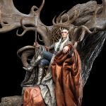 The rich detail was achieved through a combination of digital and physical sculpting. Once the form was 3D printed, Steven applied a base layer of clay and worked methodically to capture a range of textures by hand. The resultant statue is one of great contrast; of surfaces rough and matte; smooth and glossy. Flattened staircase slabs and intricate fallen foliage. Above it all, the curling antlers of the Elven throne, half-carved, half-grown, with the King himself sitting in autumnal fabric, majestic.