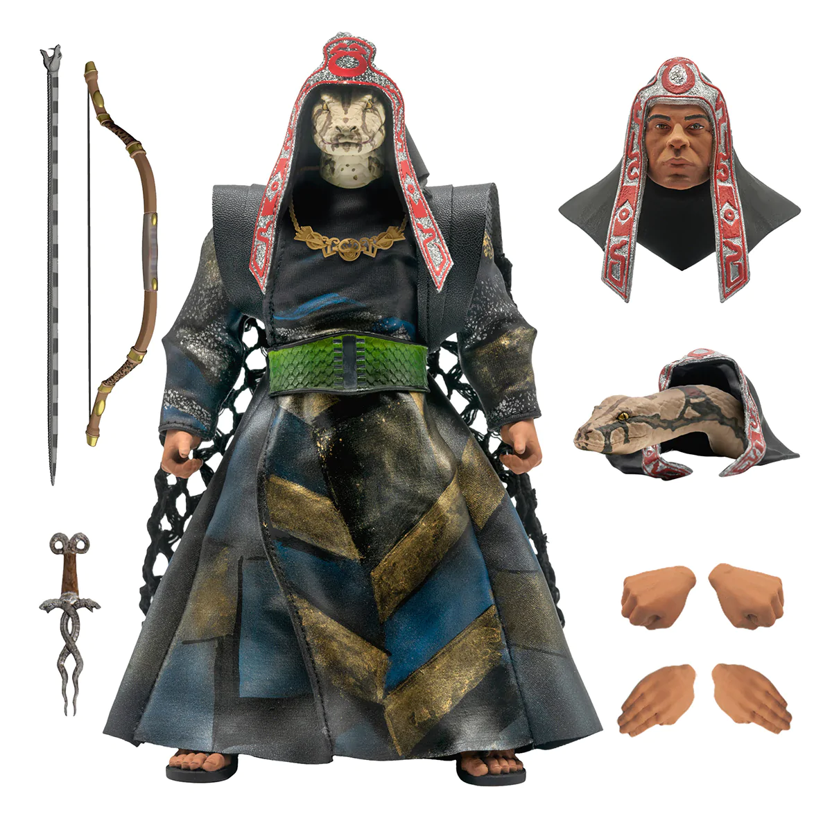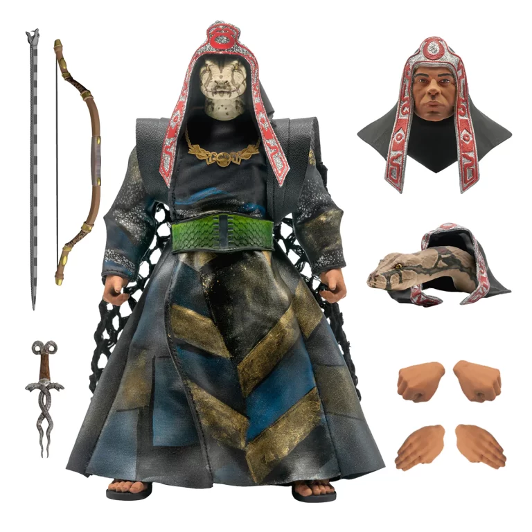 “What will your world be without me, my son?!” Mere mention of the powerful wizard Thulsa Doom causes mortal men to quake in fear, but when transformed into the Snake Priest it’s no wonder he is a match for even the mighty Conan. This Thulsa Doom ULTIMATES! Figure, based on the transformation scene in Conan the Barbarian, comes with both a snake head and a human head with snake eyes, a full soft goods robe, his bow and snake arrow, plus a standalone snake. This 7″ highly-articulated action figure is made-to-order and limited edition.