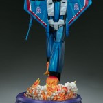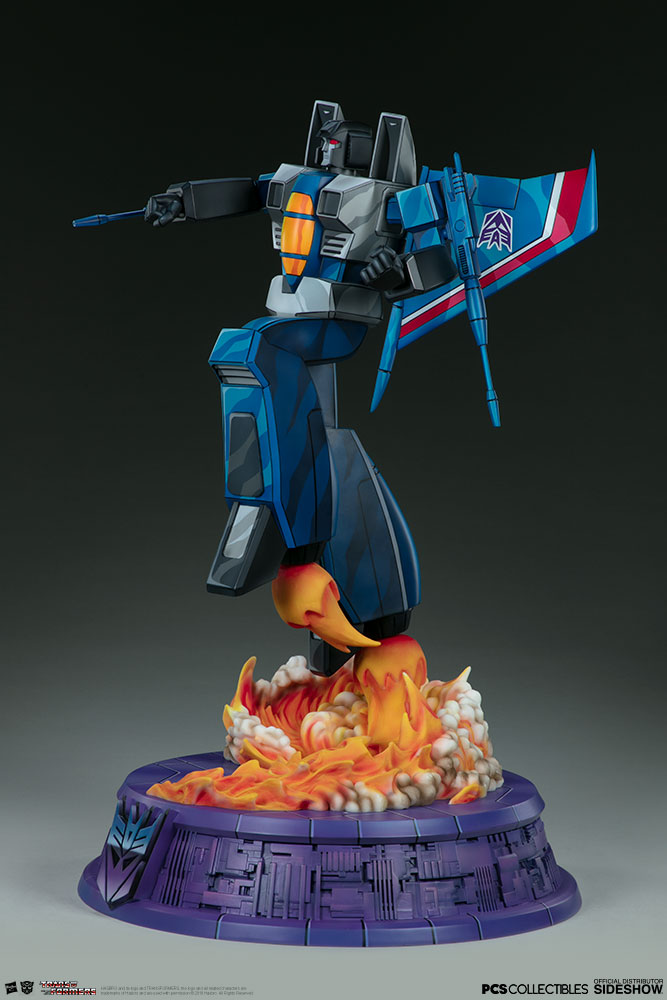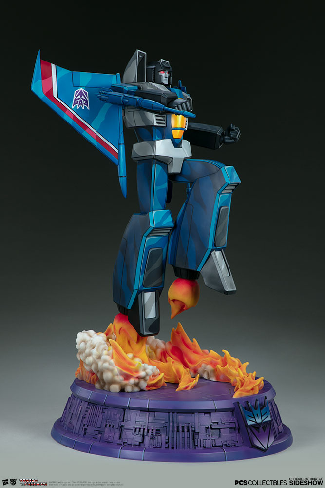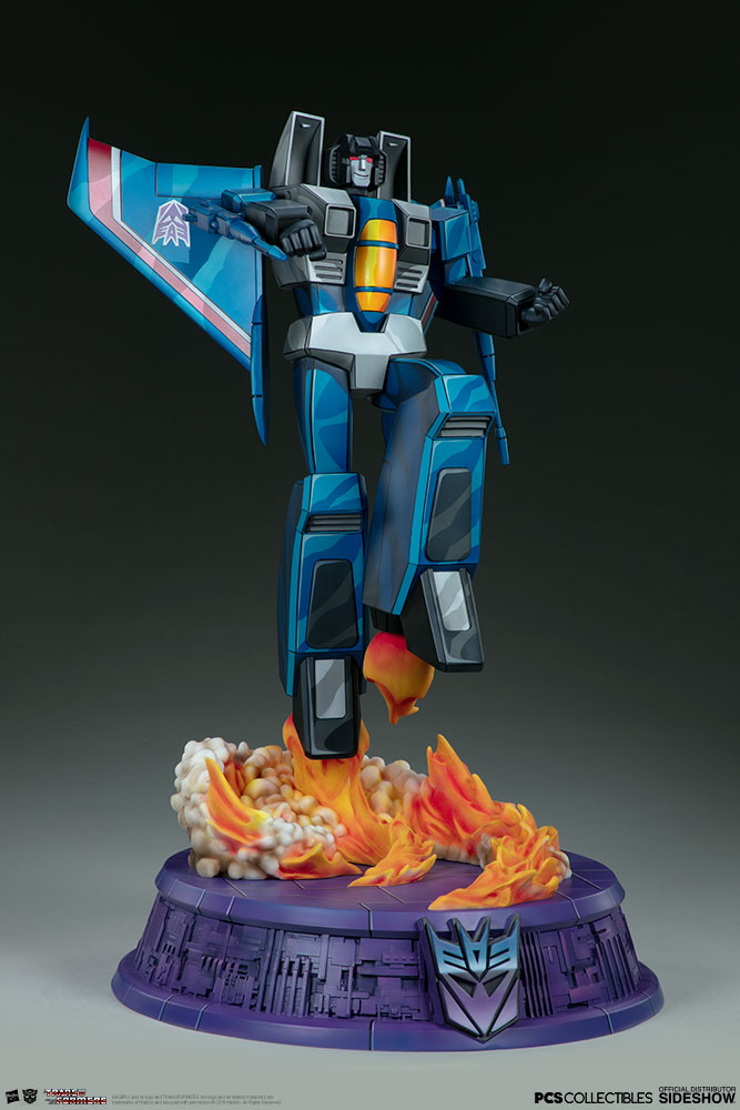 The Thundercracker Statue measures 26.5” tall, as the treacherous jet fighter launches off of a purple mechanical base detailed with the Decepticon logo. A sculpted trail of vapor and flames rises off the podium base, detailed with movement and colors that blend realism with stunning cartoon designs.