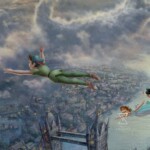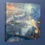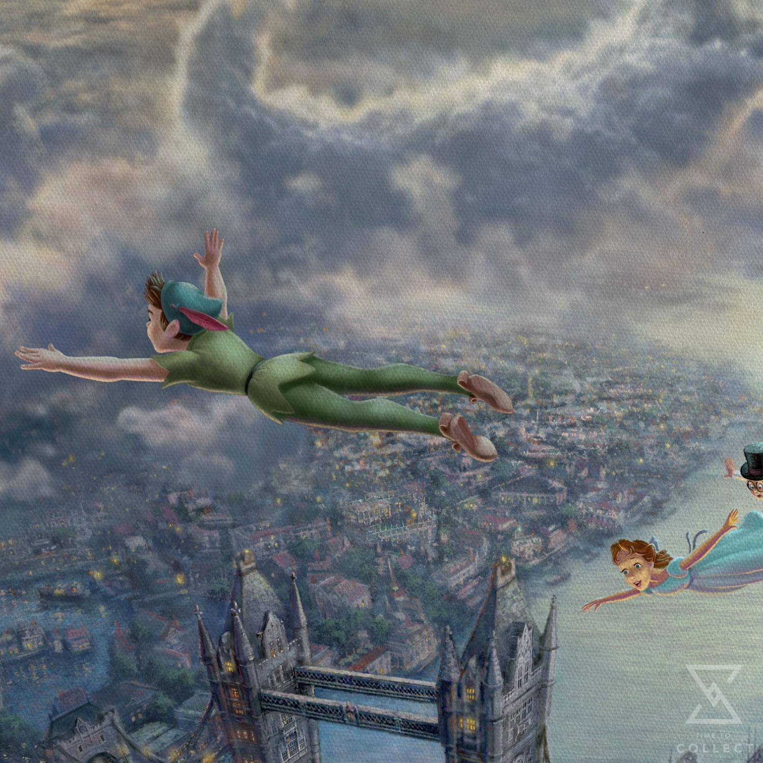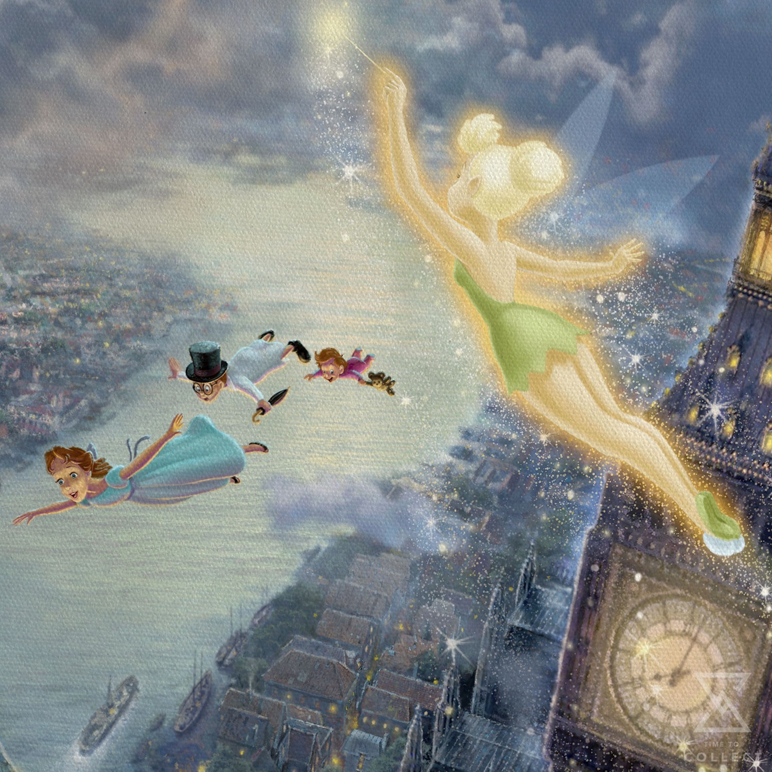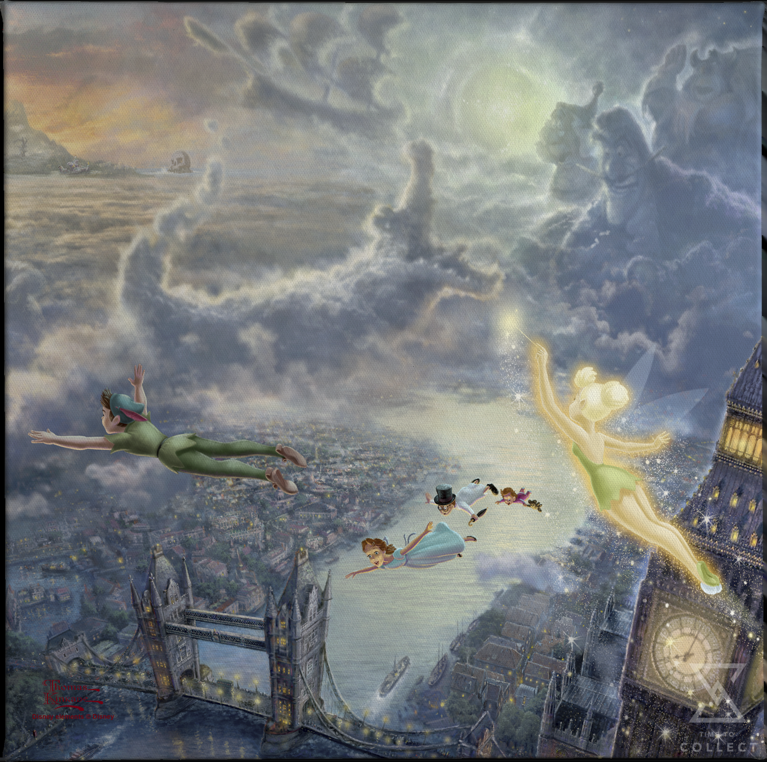 “As with the first two paintings in my twelve-piece Disney Dreams Collection (affectionately referred to as the “Disney dozen” by die-hard collectors!), I try to tell the whole story in a single image – what I refer to as a “narrative panorama”. We see Neverland in the distance, just below the “second star to the right”, as the full moon bathes the scene with its silvery glow. The lights of London twinkle along the river Thames, as the clouds take shape, if only in our imagination, as characters from the adventure – Captain Hook, Smee, the Lost Boys, and the ubiquitous ticking crocodile. But for me, the central character of the story will always remain Tinker Bell, the enchanted fairy princess who makes the entire journey of imagination possible.” – Thomas Kinkade Studios