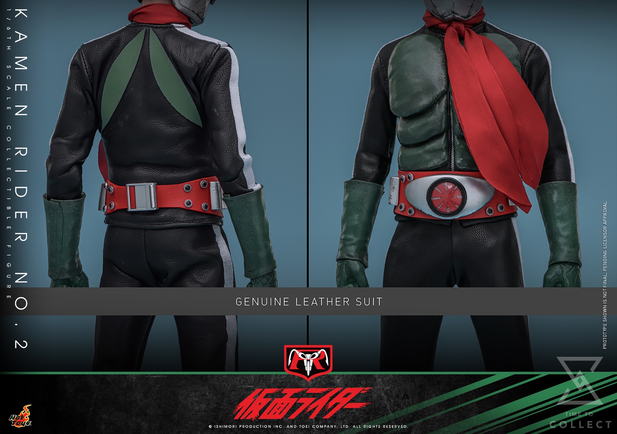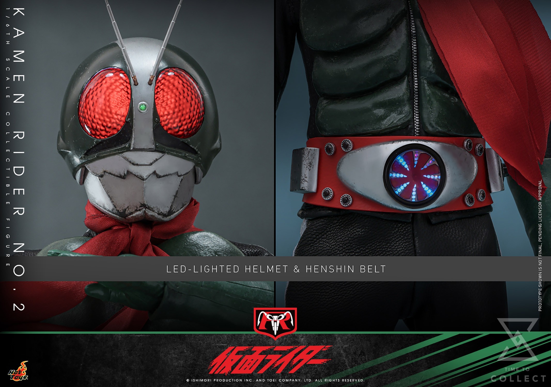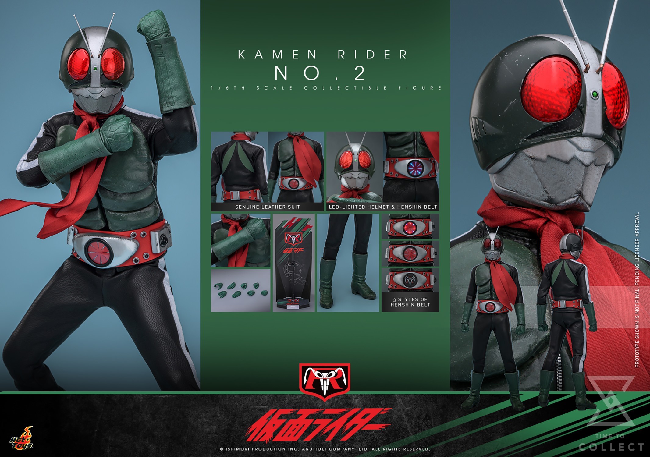 The highly accurate Kamen Rider 2 sixth-scale action figure is exquisitely crafted, featuring a newly developed LED-lighted helmet with antenna and revealing hair detail. The iconic suit is finely tailored using genuine leather with signature white stripes on the side. Meanwhile, the bright green Converter Lung, gloves and boots go perfectly with the red wired scarf, contrasting the black suit underneath. The suit would not be complete without the iconic Henshin belt. The LED-lighted belt comes with two styles of buckle that the transformation mode is faithfully replicated with a Henshin lighting effect. Last but not least, there are also an extra belt buckle accessory with a Kamen Rider logo and a figure stand.