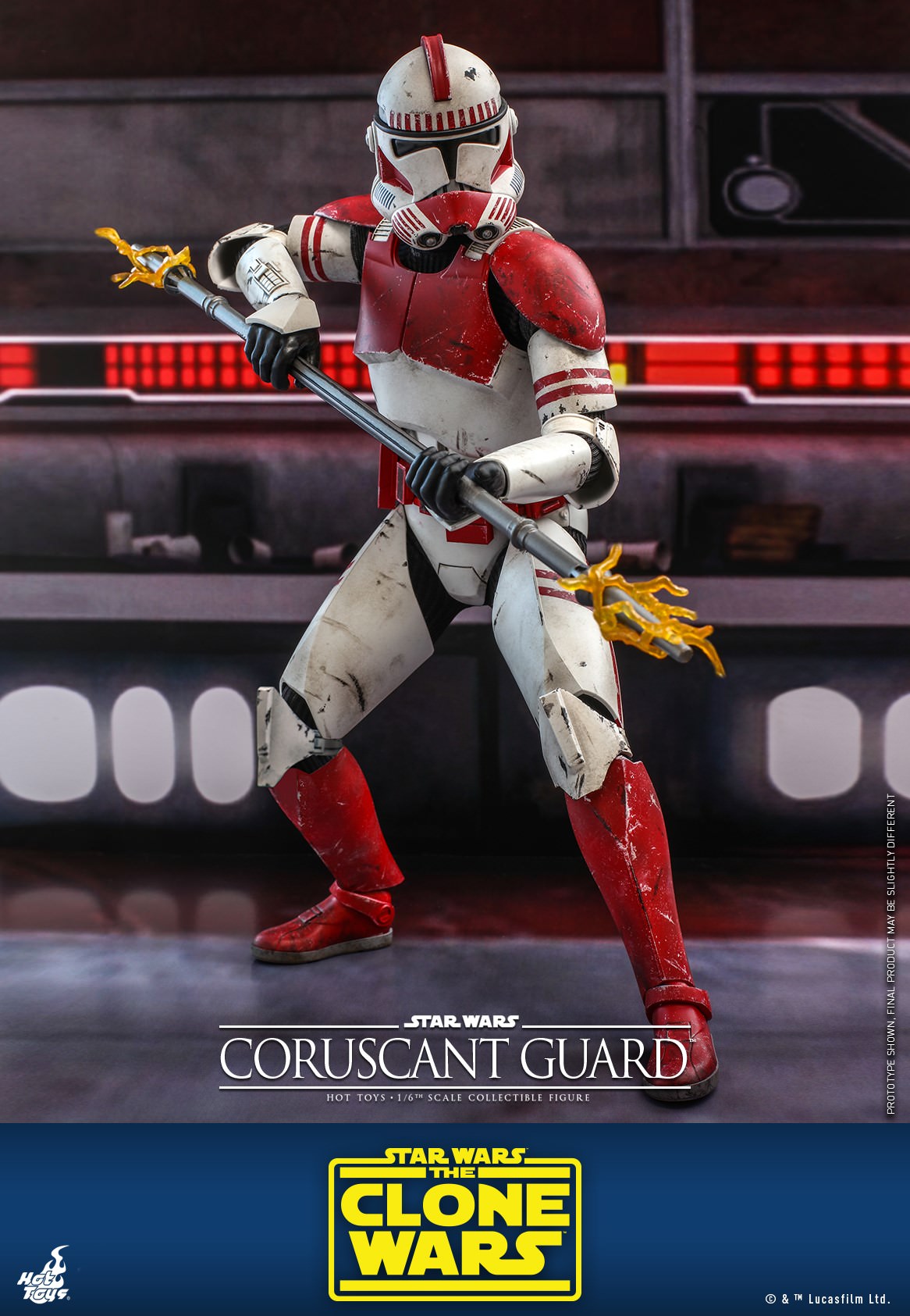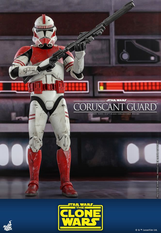 The highly detailed collectible figure features meticulously crafted and finely detailed recreation of Clone Trooper armor and helmet, Coruscant Guard’s distinctive armor color with weather effects, an assortment of weapons and a display base!