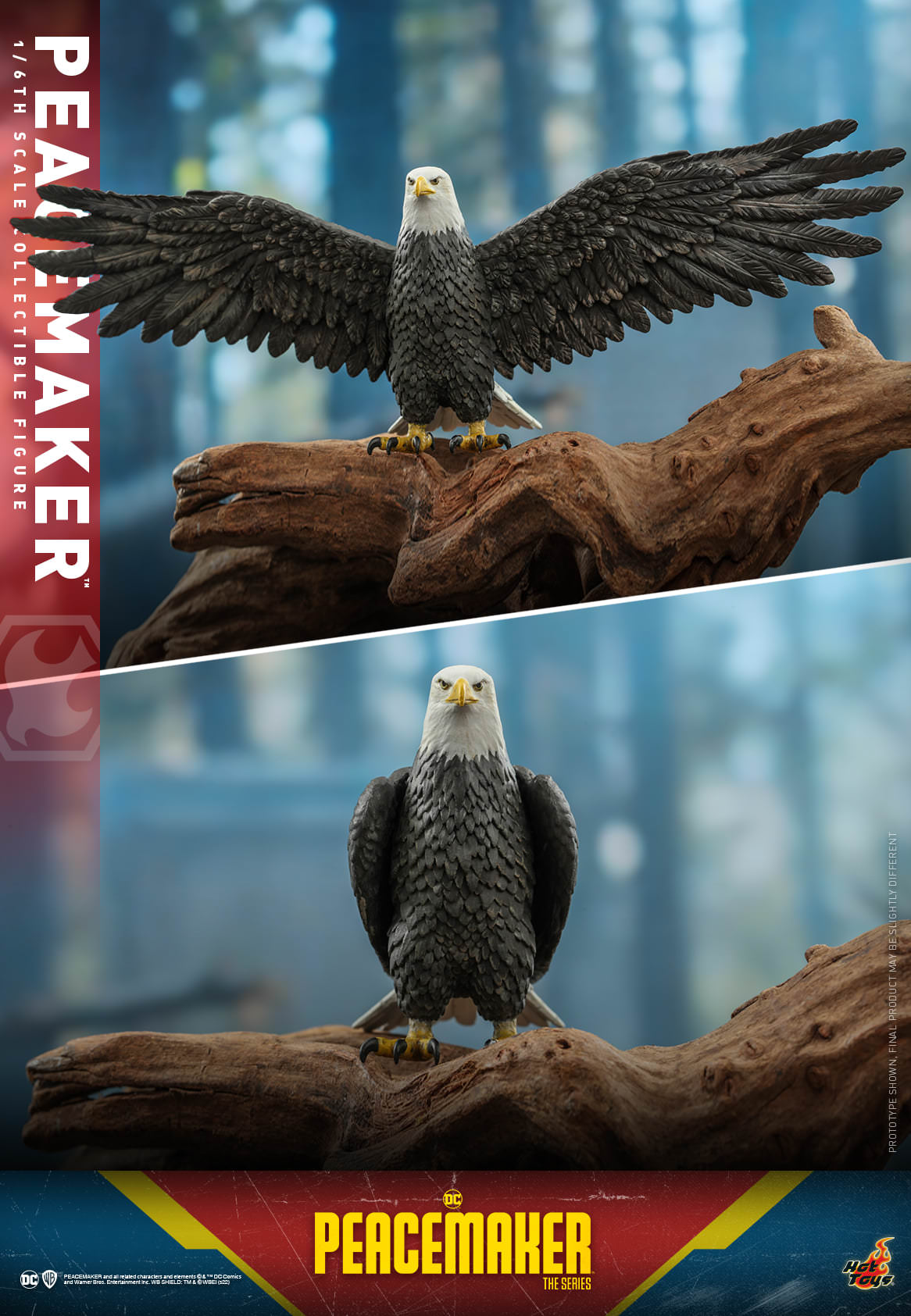 Sophisticatedly crafted with striking likeness of Peacemaker’s appearance portrayed by John Cena in the action series, the 1/6th scale figure features a newly developed helmet head and an interchangeable helmet covered in silver chrome finish with details, an attachable tongue to create alternate expressions, a specially tailored outfit, weapons including a sword, an axe, and a figure stand. The sidekick of the show – Eagly will also come as a 1/6th scale accessory with spread wings for complete collector experience.