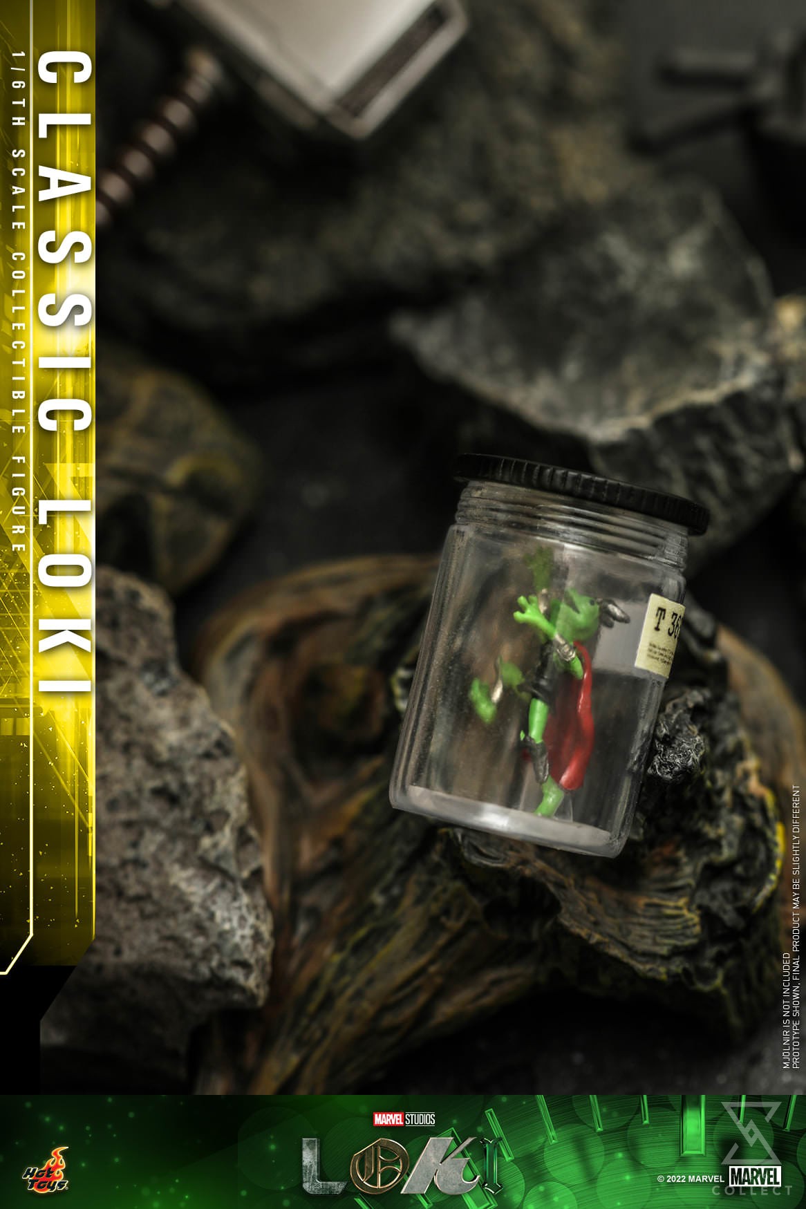 Expertly crafted based on the appearance of Richard E. Grant as Classic Loki from Loki, the figure features a newly developed head sculpt with horned helmet, interchangeable face sculpts highlighting grinning and serious expressions, iconic comic inspired costume with screen accuracy and weathering effects applied, an array of highly-detailed accessories including Frog Thor in bottle, battle damaged helmet, travel bag, Alligator Loki in one-sixth scale, green magic effect accessories, a character backdrop and a themed figure stand.