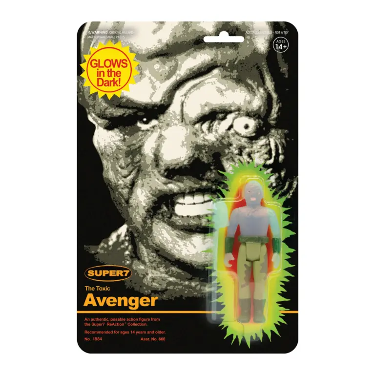 Giving the Toxic Avenger a unique blue glow just seems right when it comes to this cult-movie superhero. This Toxic Avenger 3.75” ReAction Figure is made with blue glow-in-the-dark plastic and features his signature mop accessory. If off-beat superheroes or cult-classic movies are your thing, the glow-in-the-dark Toxic Avenger ReAction figure will be right at home in your collection. The packaging is a tribute to the iconic toy company Remco.