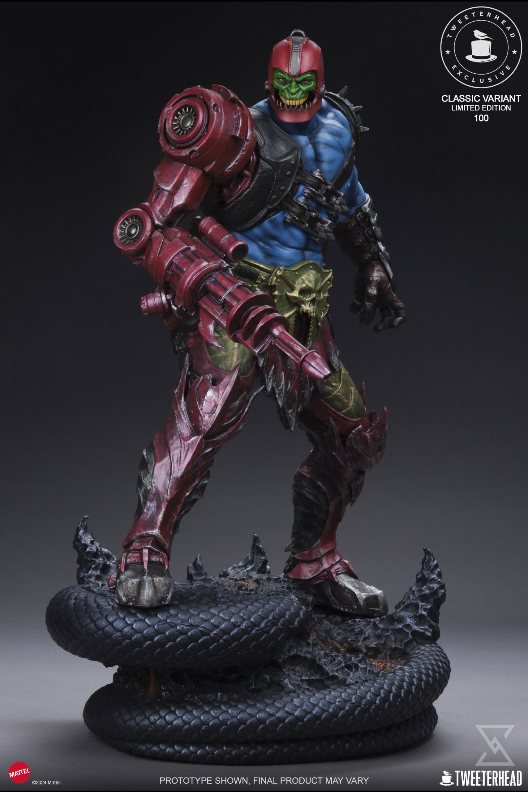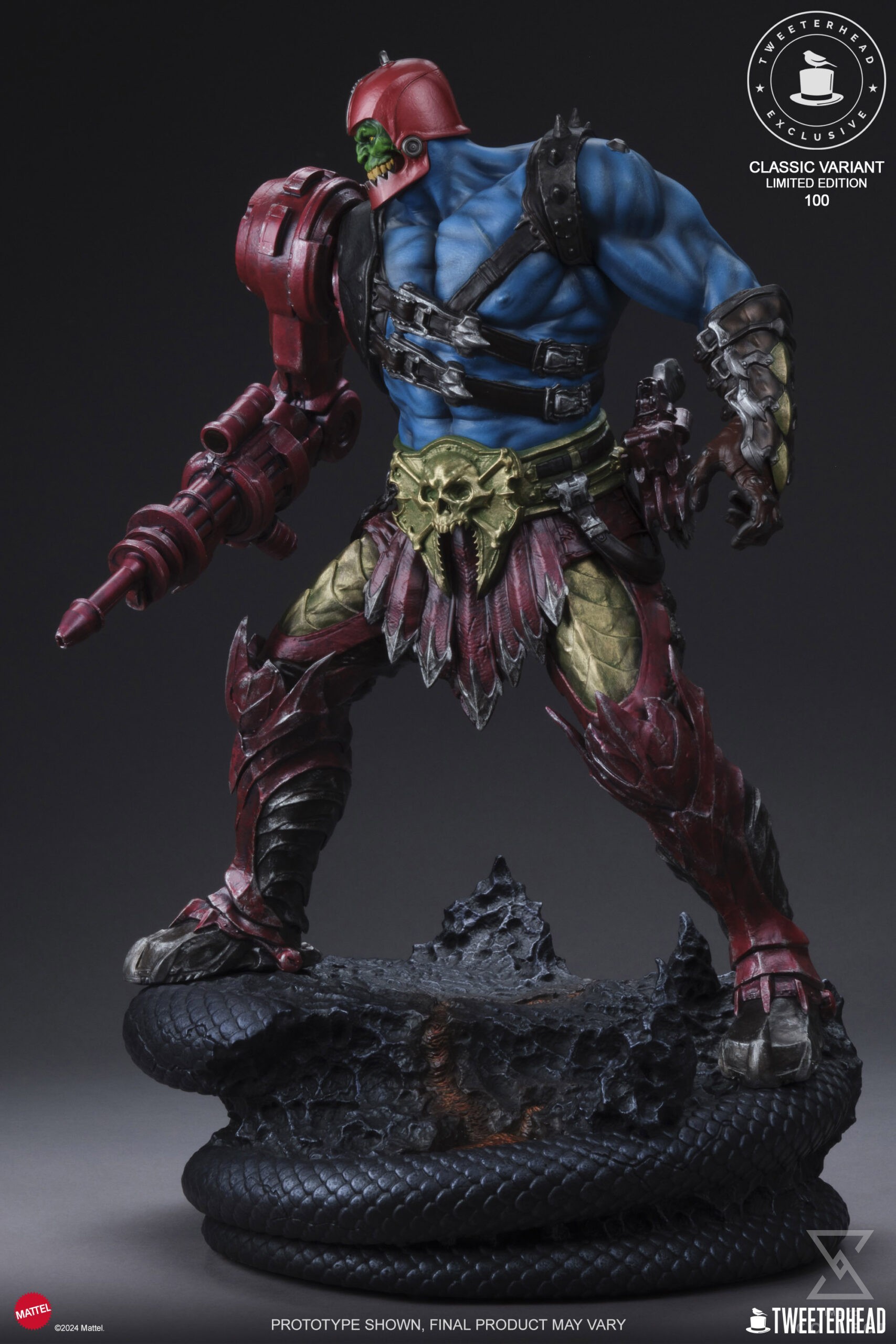 This fully sculpted polyresin statue features Trap Jaw’s “Classic Portrait”, the new “Blaster Arm”, and his original classic “Hook Arm” as well (not pictured but included). Note: this variant version does not include the “modern’ iterations of the right arm and portrait that are included with our regular edition.