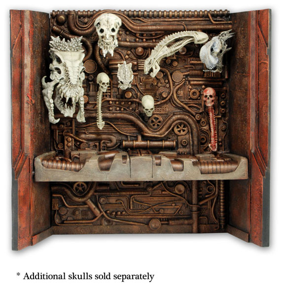 This special edition diorama measures over 11″ tall and nearly 12″ across and is a faithful replica to the Trophy Wall seen within the Predator spaceship at the end of Predator 2. This incredibly detailed diorama is a reward to the fans who have faithfully collected all the various Predators figures and Exclusives, they now have a place to display the various “trophy skulls” accumulated over the past 3 years. The diorama includes a series of plugs and attachments that will hold 8 different skulls. One large dinosaur-like skull is available exclusively with the Trophy Wall Diorama. Other skulls sold separately. A must have centerpiece for your Predator collection and a perfect place to display all of the Lost Tribe Predators.