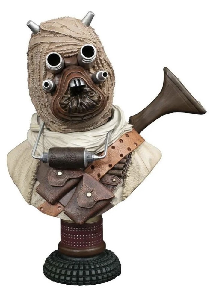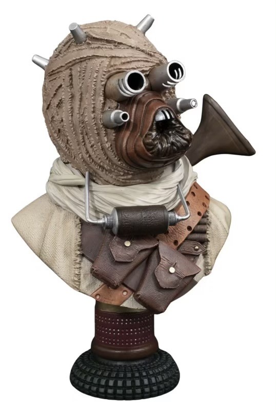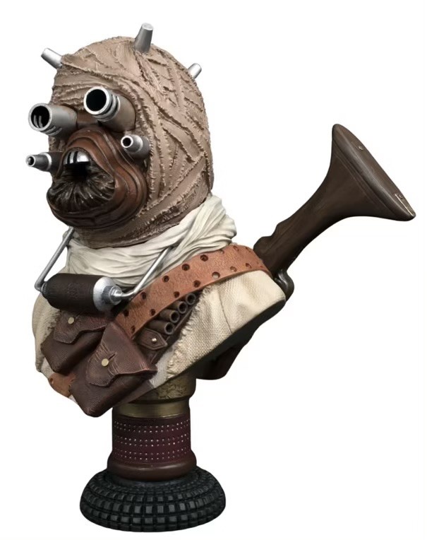 A Diamond Select Toys release! They’re legends on Tatooine, and now a Tusken Raider is the next Legend in 3D! This approximately 10-inch, half-scale bust depicts one of the sand people in his traditional garb, with a rifle slung on his back, atop a base fashioned after a gaderfffii stick. Limited to only 1,000 pieces, each highly detailed bust is hand-painted and comes packaged in a full color box with a hand-numbered certificate of authenticity.