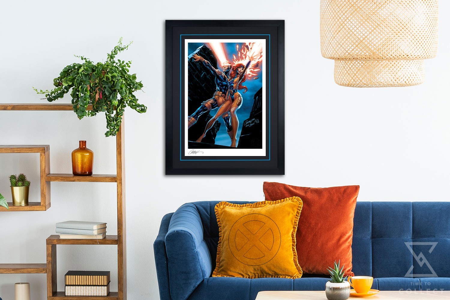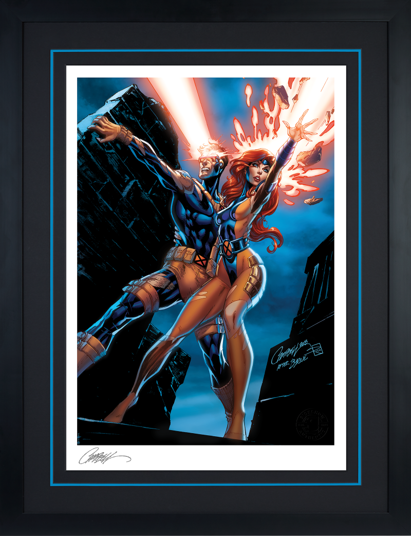 Through the ages, Scott Summers and Jean Grey have stood by one another in hardship and in hope. Fan-favorite comics artist J. Scott Campbell depicts this popular mutant duo in the heat of battle, fighting side by side against all odds. Clad in their classic 90s-era Blue and Gold team costumes, Cyclops and Jean Grey stand tall against a darkened sky, while the brightness of Scott’s optic blast and Jean’s telekinesis illuminate their path to victory.