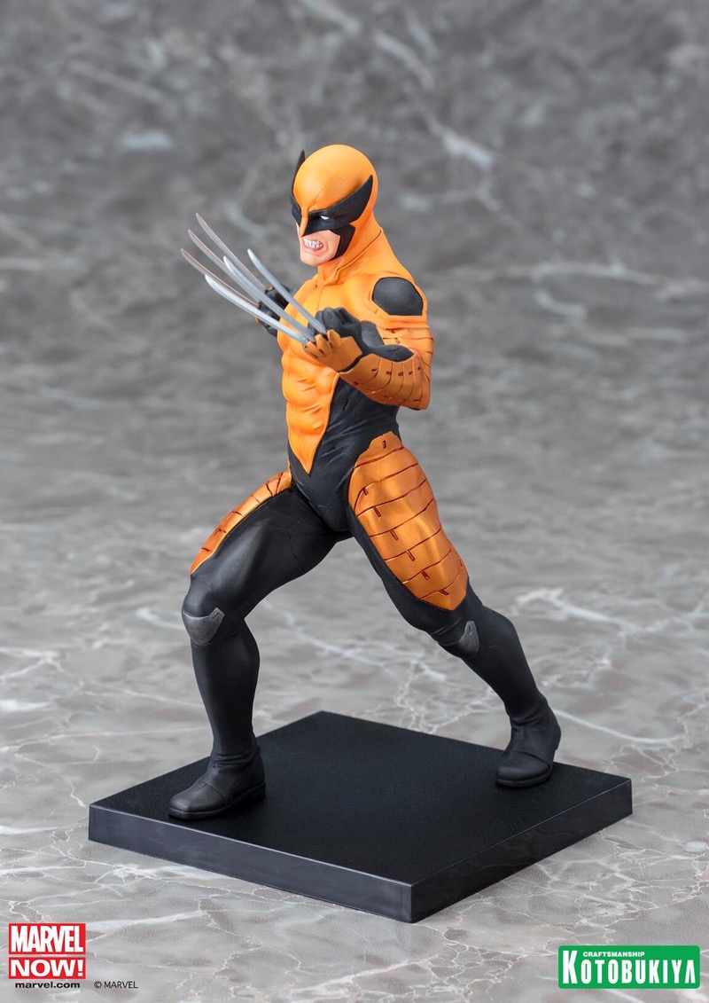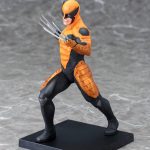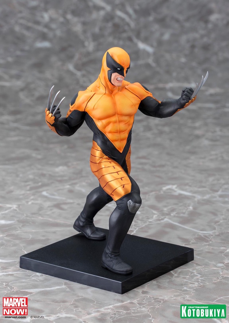 A nearly immortal mutant with a powerful healing factor and heightened senses, Wolverine was further enhanced by an adamantium-laced skeleton and ultra-sharp claws. Throughout his years with the X-Men (and other teams) he’s worn several different costumes, and this new version is the ARTFX+ debut of his unique Marvel Now outfit consisting of a tough, combat-ready uniform. It’s a full bodysuit revealing only the lower part of his face, though of course his claws protrude through it as well. Wolverine is captured in mid-lunge, stepping forward with his right leg as he jabs his left hand for a lethal strike. The stark black and yellow armor sections of his costume make a cool “X” out of negative space, and it includes his trademark pointed cowl. Logan’s face is contorted into a fierce snarl as he attacks his enemies, and he looks super cool with his eyes covered by the pure white lenses of his costume.