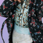 In this colorful representation, V points, one hand floating near his cherry red hair and the other extended out to the crowd. He wears a powder blue shirt and white trousers with his black floral robe sweeping out as he steps to his next dance move.