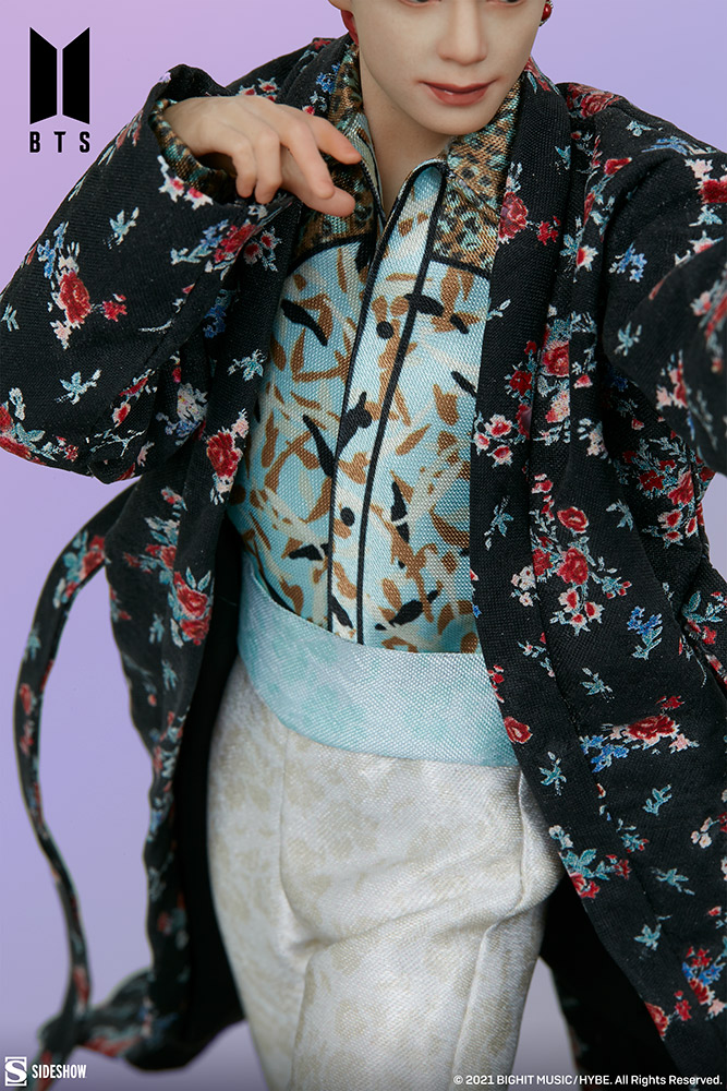 The V Deluxe Statue measures 9.1” tall and 8.4” wide and features an intricate mixed media costume application. The carefully tailored outfit includes wire for posing the robe fabric to capture the dynamic movement of V’s stage presence. Complete with sculpted details like an earring and white shoes, the energetic figure stands on a black stage base to match the other members of the collection.