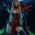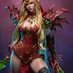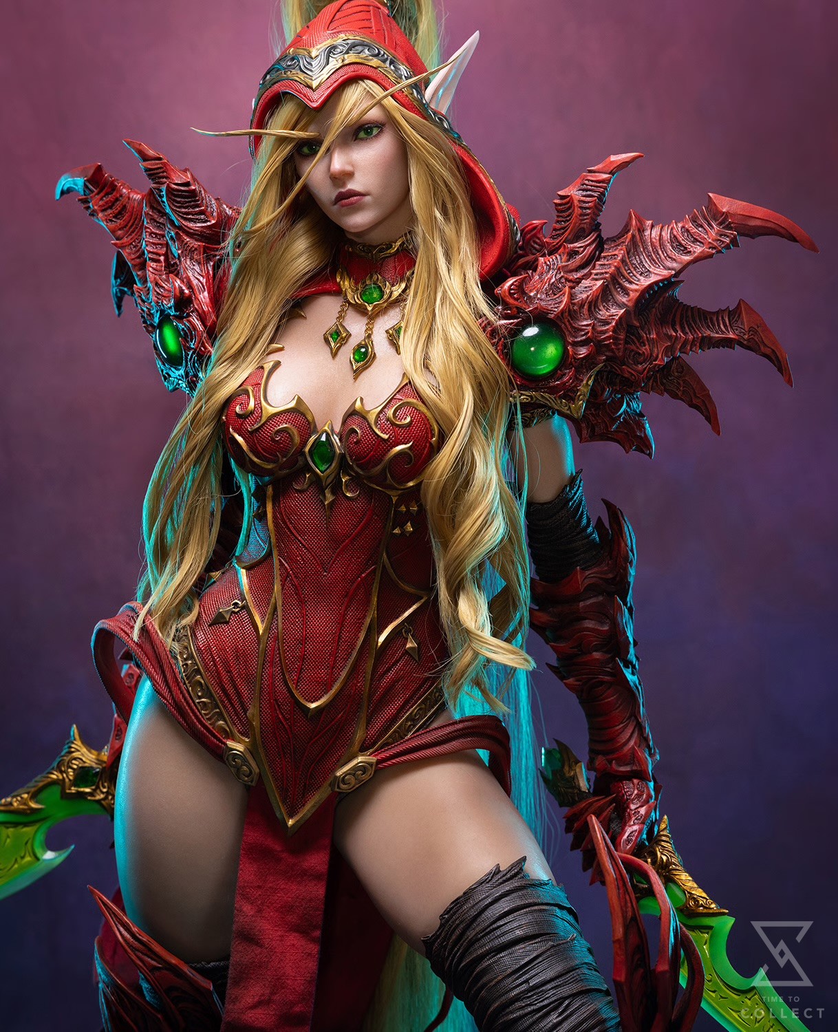 Her hair is recreated using high-temperature hair implantation technology, reproducing the bangs and high ponytail. The eyes glow, reflecting the green eyes of a blood elf corrupted by fel magic. In addition to using silicone material, the head sculpture features glowing prosthetic eyes, recreating Valeera’s deep green, glowing eyes. Made with silicone material, realistically restoring her beautiful figure and delicate skin. The body and torso are made of silicone to ensure consistency in texture. We crafted the exposed skin parts of the character in silicone to achieve the best texture and touch.