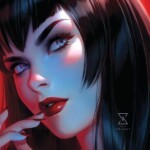 Direct from Drakulon comes everyone’s favorite vampiric vixen, bathed in gentle light against a sea of deep red. Artist Warren Louw captures the mesmerizing appeal of Vampirella in this stunning illustration as she poses coyly, her raven hair contrasting sharply with her pale complexion. Vampi’s bombshell beauty hides the beast within, thirsting for a drink of blood behind her pouting lips as she considers where to stop in for a bite.
