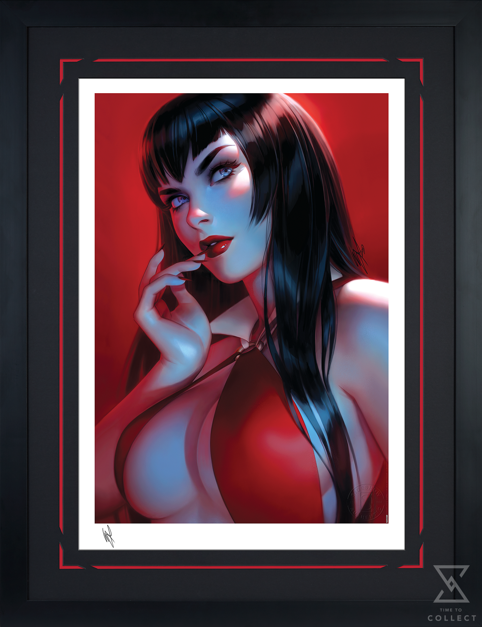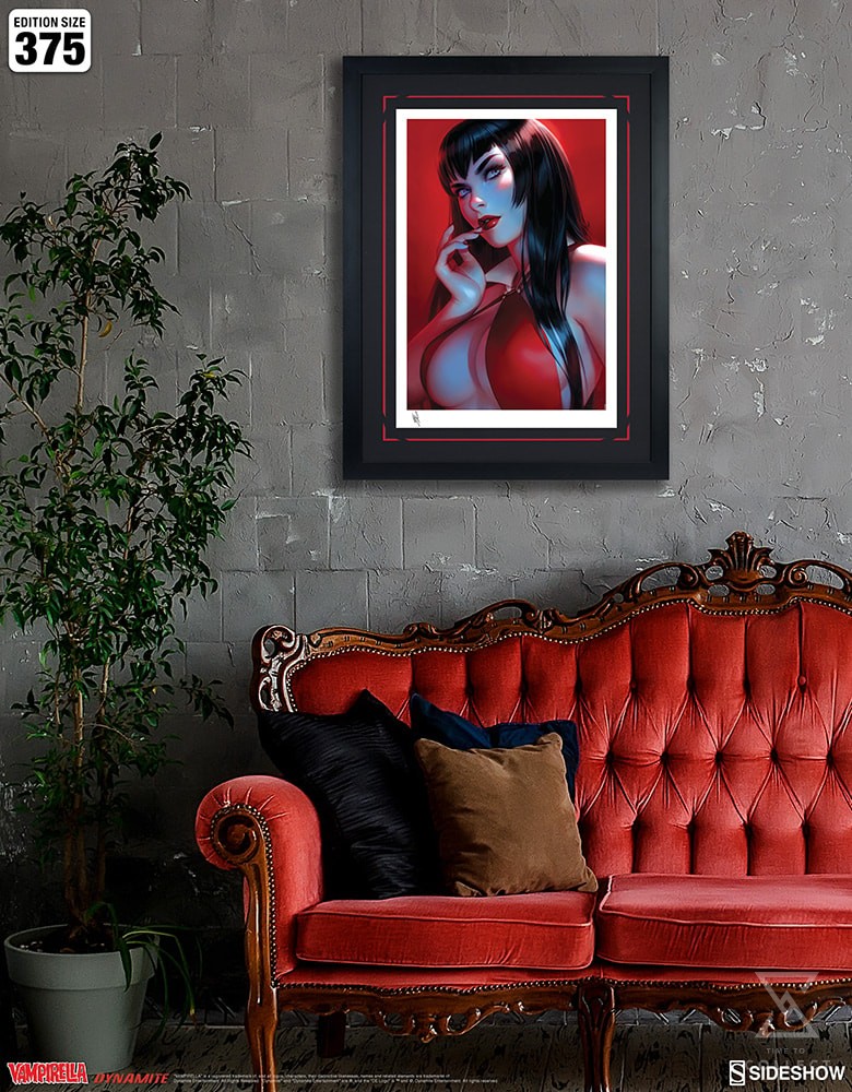 Originally created as a retailer exclusive variant cover for Vampirella #7 (2020), written by Christopher Priest for Dynamite Entertainment, this dazzling portrait is now available in a fine art format for collectors to enjoy. Each Vampirella #7 Fine Art Print features an authorized, automated artist signature and an embossed Seal of Authenticity as a part of the limited edition of 375 pieces.