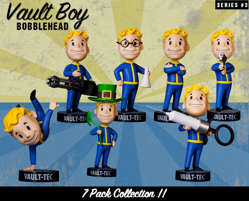 The FalloutĀ® 3: Vault Boy 101 Bobbleheads Series Three includes Agility, Arms Crossed, Big Guns, Luck, Medicine, Science and Small Guns and is the final series of bobbleheads from our FalloutĀ® 3 range of bobbleheads.