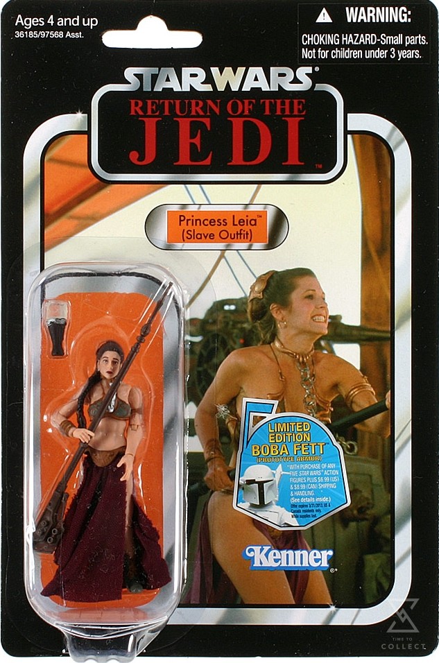 The figure’s clothing reflects the outfit worn by Princess Leia when she was enslaved in Return of the Jedi.