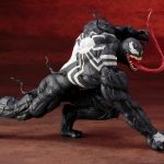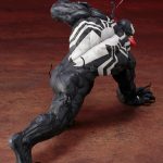 Never one to prefer patience or lying in wait, Venom lunges forward on the attack! The symbiote is massively muscled, with an intricately sculpted alien physiology and small tendrils erupting from its skin. Venom rushes forward on all fours, his right leg propelling him forward with the left tensed beneath his body while he balances on his outstretched right arm and brings his left arm up to strike with his claws. Venom wears his trademark smile, a huge skull-splitting grin exposing frightening teeth while the creature’s shockingly long tongue snakes out of its mouth and curls up into the air. The symbiote is black with bright white spider markings on its chest and back, squares on the back of its hands, and its enormous eyes; meanwhile, Venom’s horrific tongue is a wet, fleshy red! Sculpted by Junnosuke Abe (RESTORE), Venom is just over 5 inches tall (in the ARTFX+ 1/10th scale) in his lunging pose, and magnets provide perfect stability on the included display base. Venom is an incredible display piece on his own and looks great with the other Spidey-related characters in this series… but of course the best thing is having Venom confronting Peter Parker Spider-Man himself!