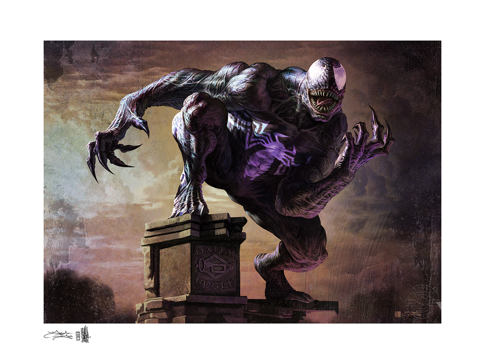 Fear the sinister symbiote Venom as he menaces the Marvel Universe with his lethal brand of vigilantism. Venom stands crouched atop the Daily Bugle building, bonded with Eddie Brock to create this monstrous antihero known for his razor-sharp teeth and hunger for vengeance against his enemy Spider-Man. This exciting variant captures a more classic version of the fan-favorite character, with sinewy muscles shadowed with deep purples and blues to give the symbiote substance a unique and vibrant visual texture as he stalks through New York City in search of a snack.