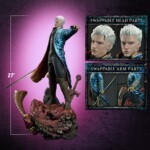 The statue offers versatility with swappable parts, including a normal head and a dual display head. This allows collectors to select their preferred expression and display options, especially when paired with the Devil May Cry 3 Dante statue. Additionally, a left hand holding a scabbard and a dual display left hand are included to add depth to the character’s pose.