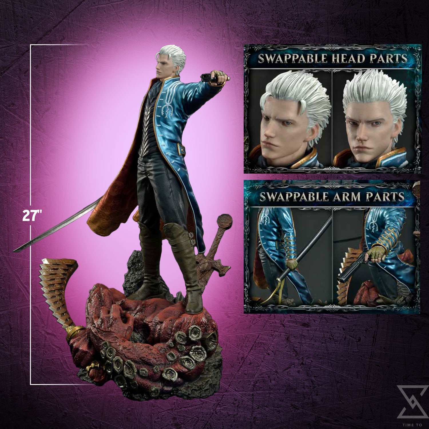 The statue offers versatility with swappable parts, including a normal head and a dual display head. This allows collectors to select their preferred expression and display options, especially when paired with the Devil May Cry 3 Dante statue. Additionally, a left hand holding a scabbard and a dual display left hand are included to add depth to the character’s pose.
