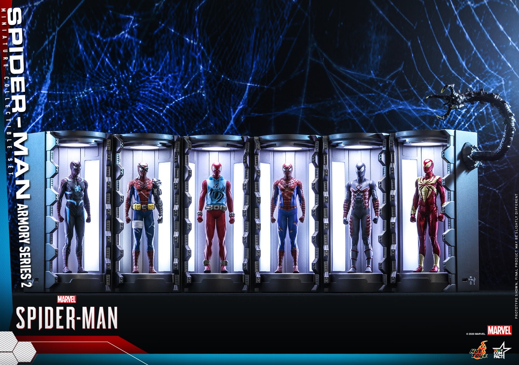 The brand new Marvel’s Spider-Man Spider-Man Armory Miniature Collectible (Series 2) line-up specially features Spidey suits in miniature size including the Secret War Suit, Cyborg Spider-Man Suit, Scarlet Spider Suit, Damaged Classic Suit, Electrically Insulated Suit, and Iron Spider Armor; display heroically upright in the reimagined armory with LED light up function. Each Armory Collectible measures approximate 12cm tall, whereas each Spider-Man mini-figure measures approximately 8.5cm tall. Collectibles are available individually.