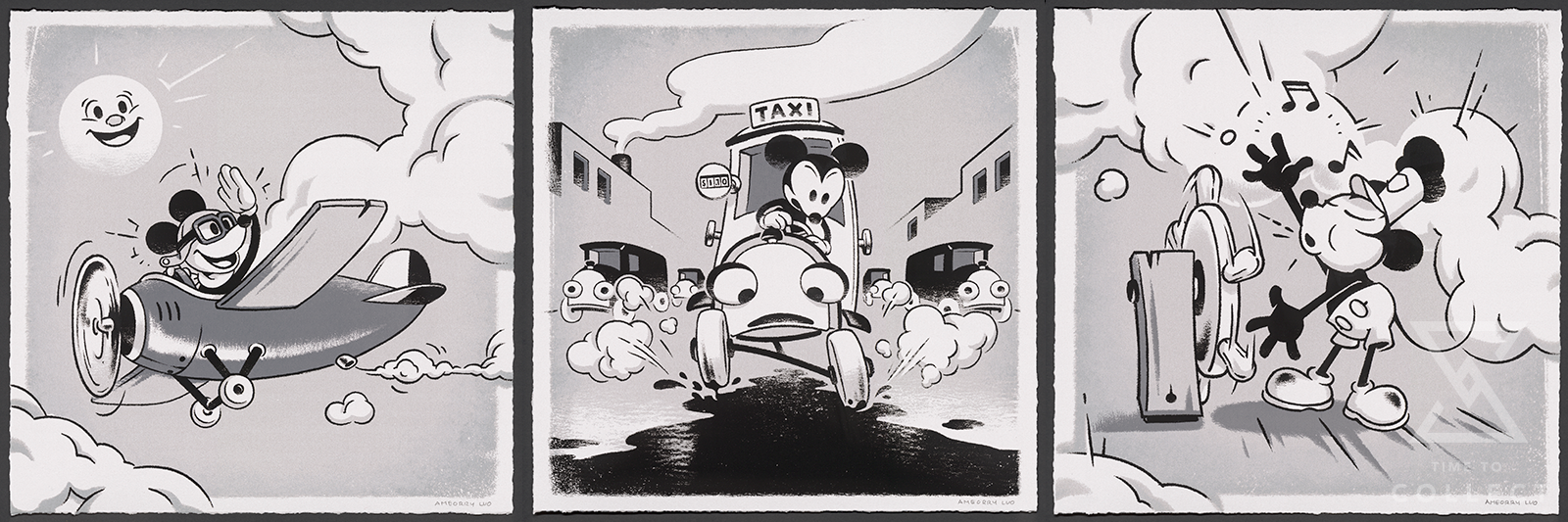 By plane, steamboat, or taxi, prepare to be whisked away with this incredible Mickey Mouse art print set! Each screenprint is hand-signed and hand-numbered from a limited edition of 125, and will surely bring a touch of adventure to your Disney fine art collection.
