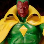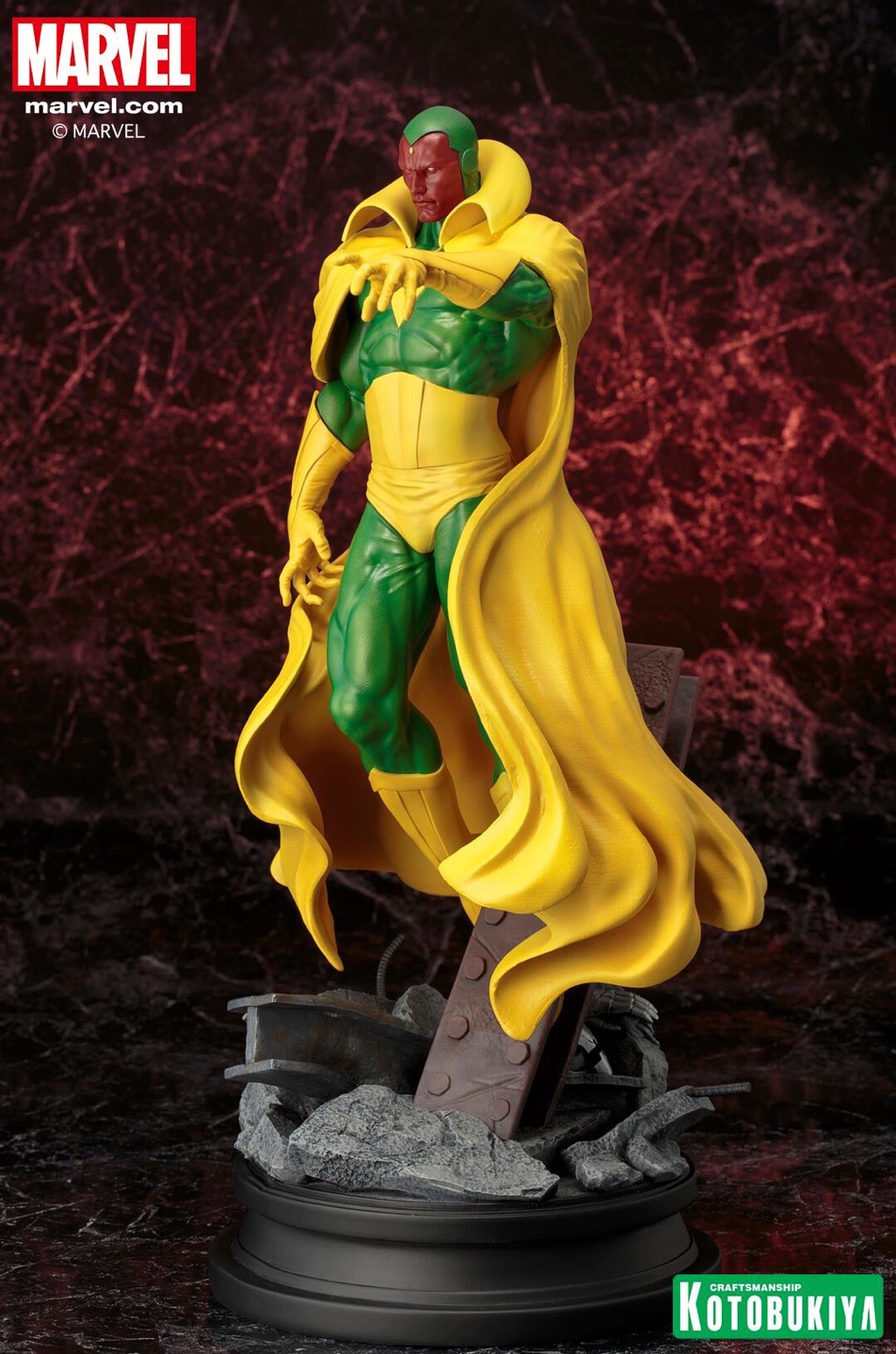 A KOTOBUKIYA Japanese import! After the mad titan Thanos the exclusive Marvel Universe Fine Art Statue series from Kotobukiya is setting its sights on heroes once again, and up next is the mighty Avenger known as VISION! The second character to go by that name, the “synthezoid” Vision was created by the evil Ultron as a pawn in his schemes against the Earth’s Mightiest Heroes. He first appeared in the pages of the Avengers in 1968 by Stan Lee and Roy Thomas, and despite his origin was swayed to the side of good and joined up with the very heroes he was designed to destroy. The Vision is a highly advanced android with a suite of powers including flight, intangibility, super speed, energy blasts, and more. He’s gone through several different looks over the years, but now he’s coming to you in an incredible Fine Art Statue presentation capturing his most iconic appearance!
