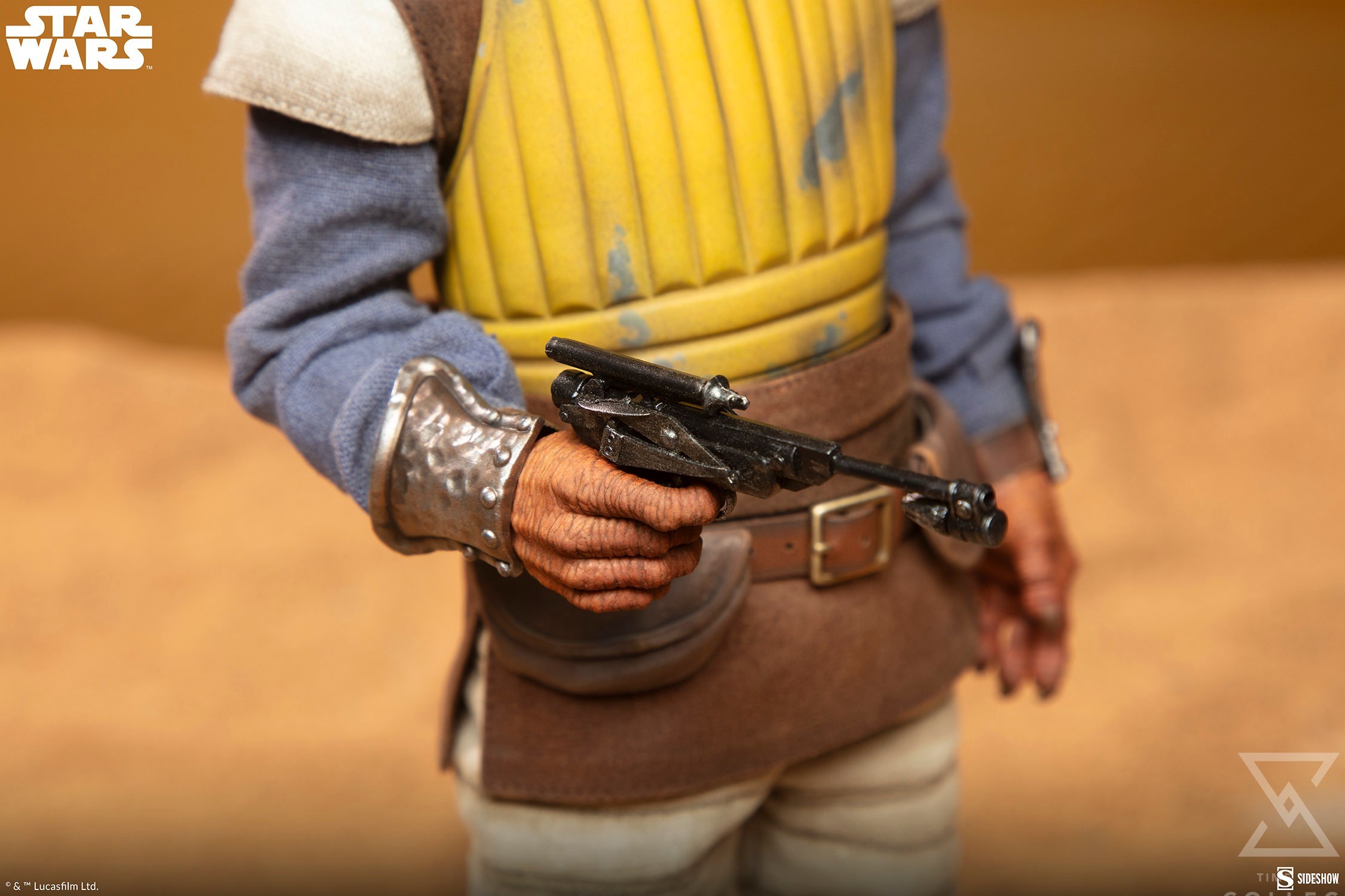 Inspired by the character’s appearance in Return of the Jedi™, this fully articulated, highly poseable high-end Star Wars figure wears tailored fabric clothing accurate to his on-screen ensemble. His outfit consists of layered blue and tan shirts, brown trousers, brown armor, a yellow vest, and a protective hat worn in harsh desert climates. The Vizam™ Sixth Scale High-End Collectible Figure also comes with two relaxed hands as well as one gripping hand for the blaster accessory.
