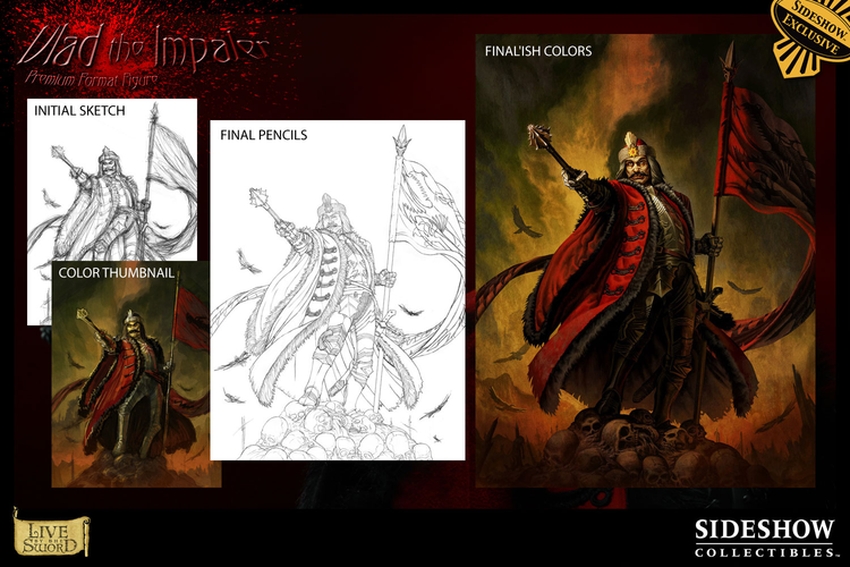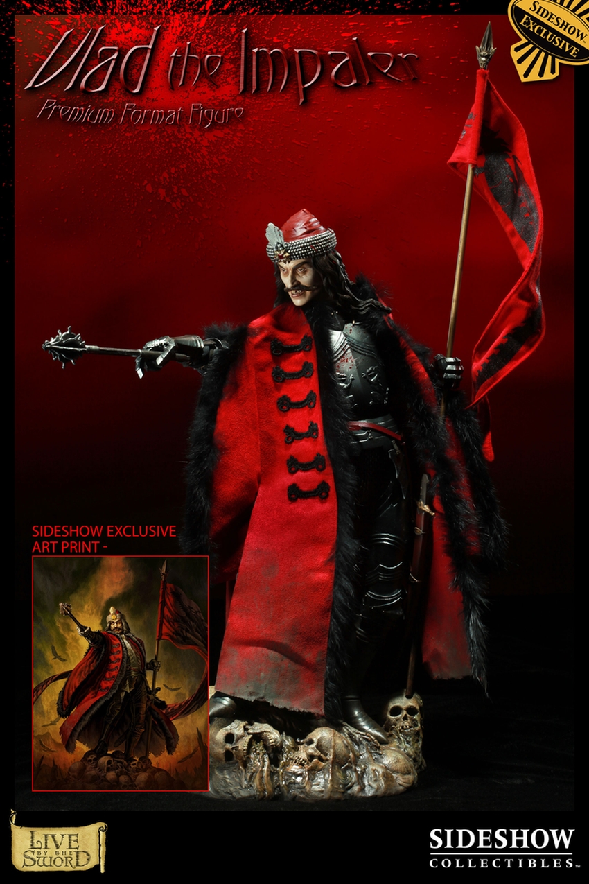 The Vlad the Impaler Premium Format figure is a stunning 1:4 scale museum quality collectible. Each piece is individually painted and finished, each with its own unique quality and detail that is the trademark of a handcrafted Sideshow Collectibles product. The figure is dressed in an incredibly detailed fabric costume, featuring an intricate, hand-sewn coat with fur trim and includes a fabric tabard, wired for posability. The figure comes complete with a switch-out helmeted head featuring a snarling vampyric likeness and adjustable mask. Standing menacingly atop a bed of victims’ skulls, mace drawn and intent on exacting his bloody and vicious will, the stunning Vlad the Impaler Premium Format Figure is an outstanding addition to any collection.