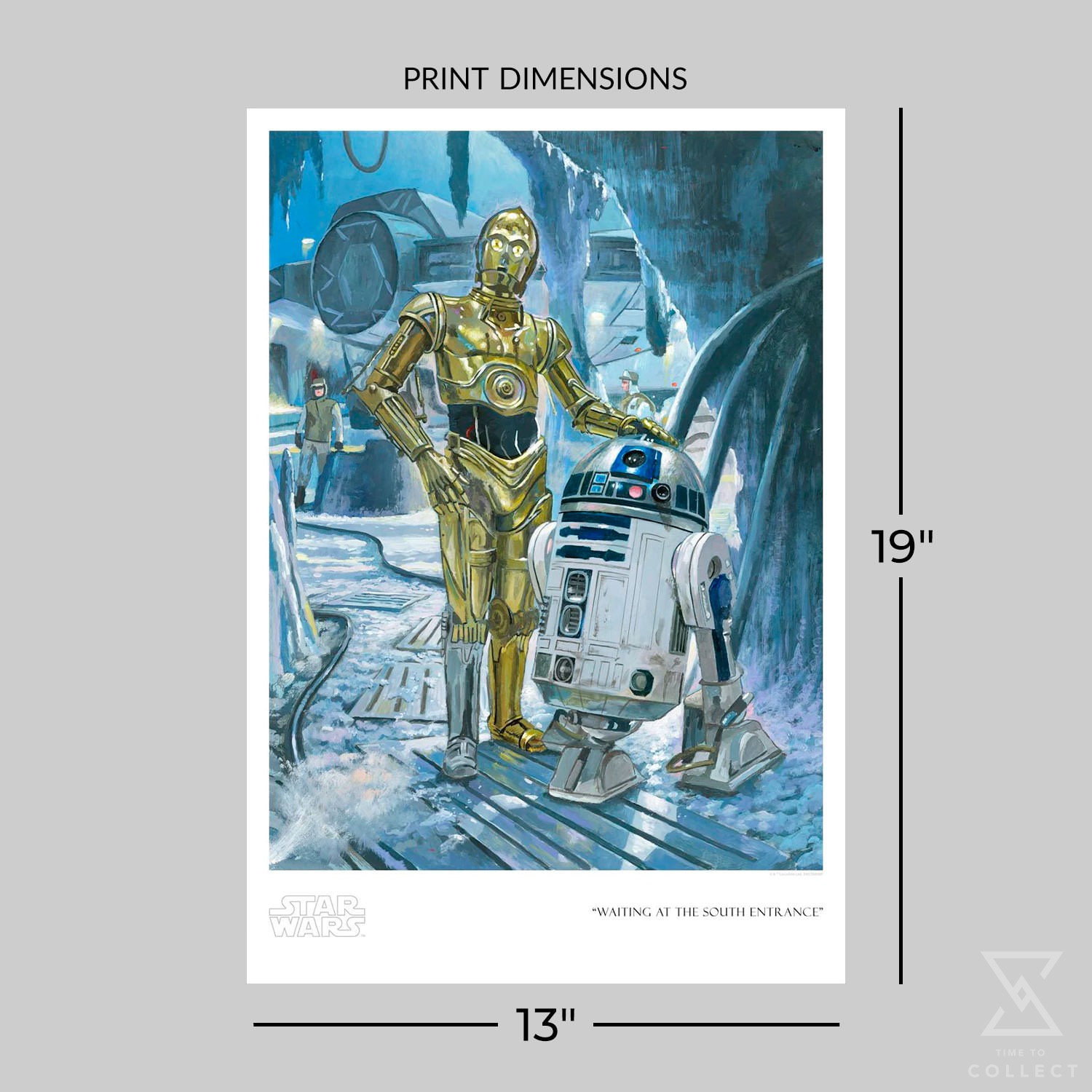 C-3PO and R2-D2 are on standby at Hoth’s Echo Base in this icy Star Wars artwork inspired by Star Wars: The Empire Strikes Back. Each fine art giclee print is hand-numbered from a limited edition of 195 pieces and comes with a Certificate of Authenticity.