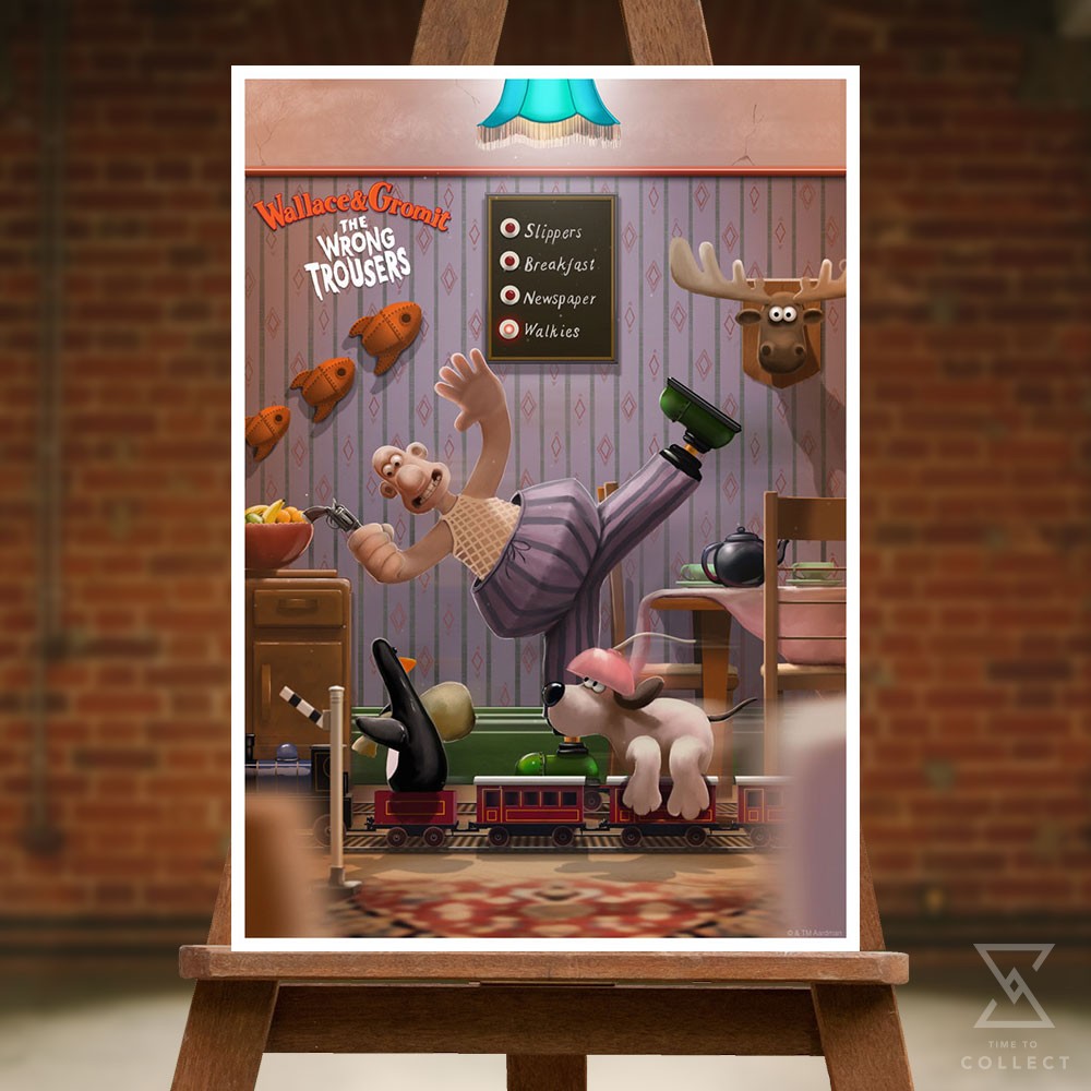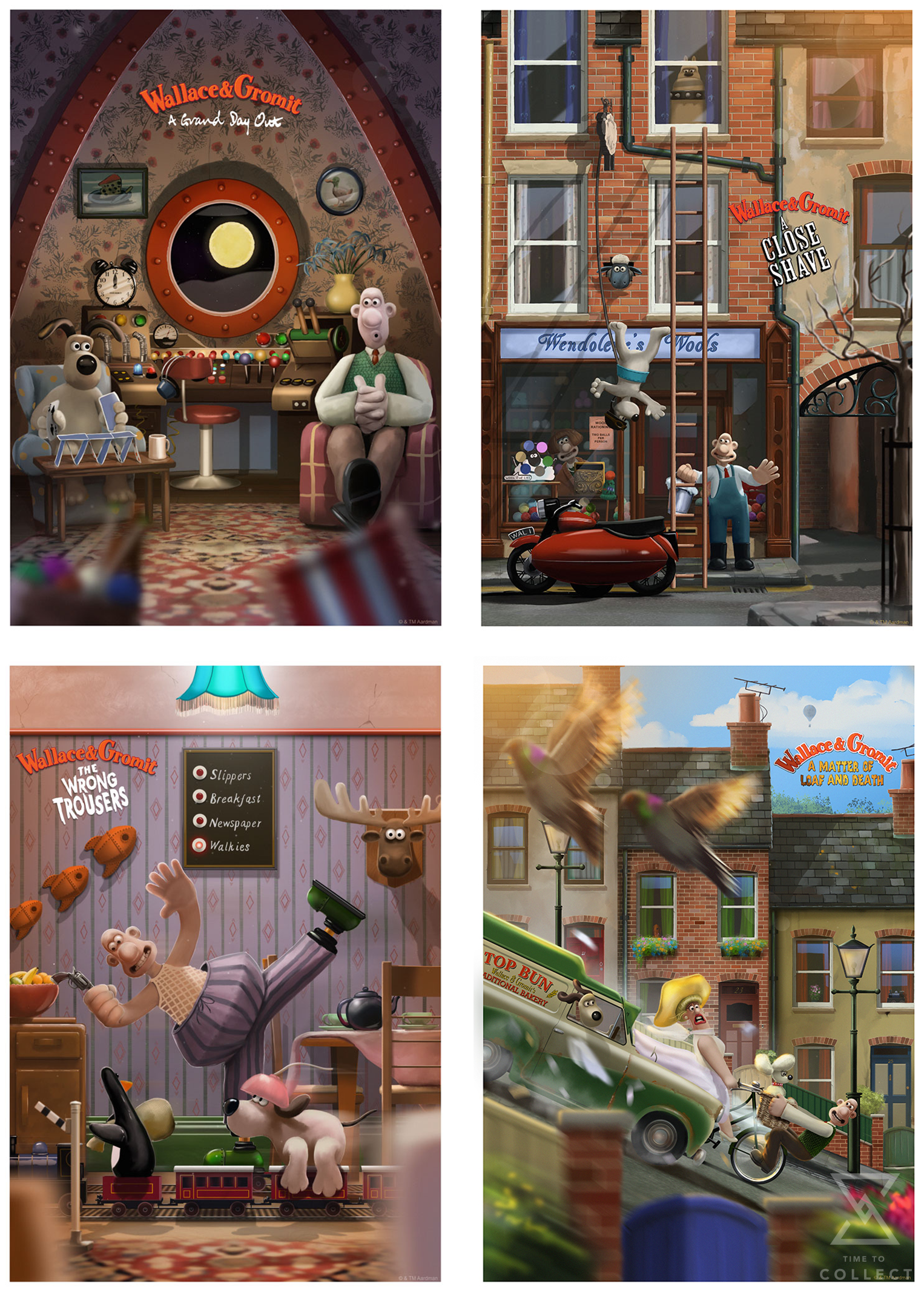 - Set of 4 fine art prints: A Grand Day Out, The Wrong Trousers, A Close Shave, and A Matter of Loaf and Death