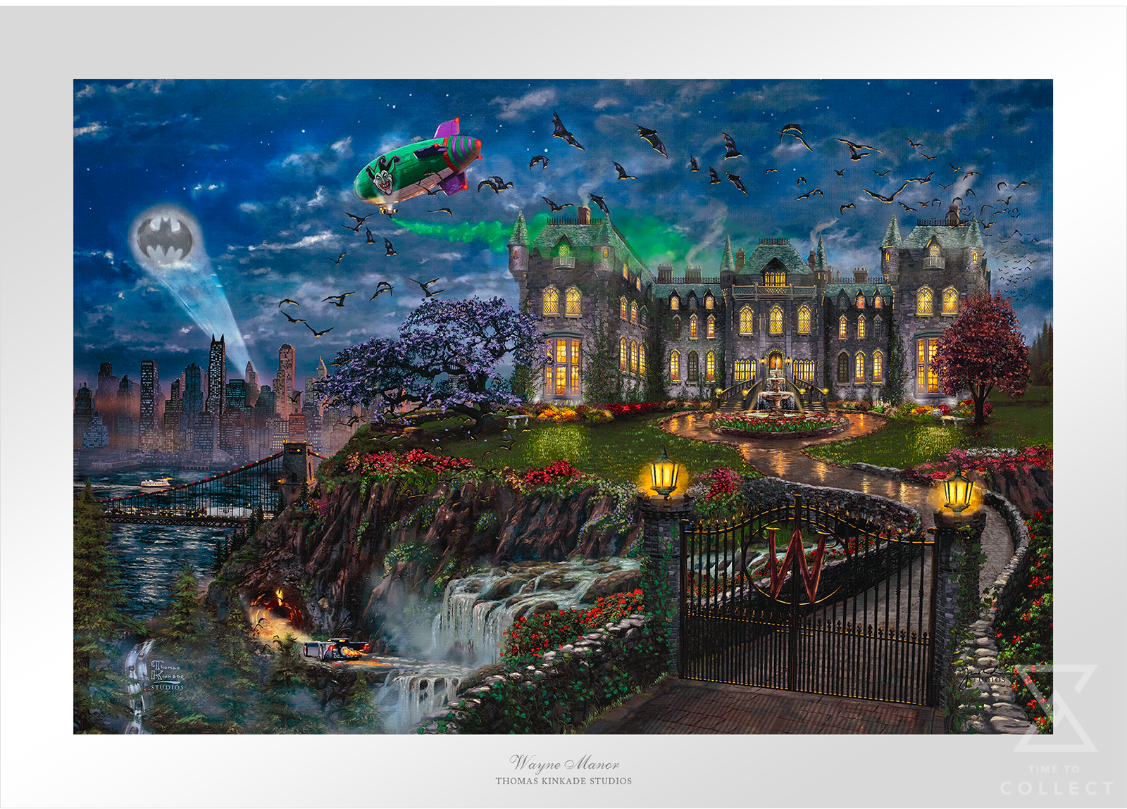 Thomas Kinkade Studios’ Wayne Manor captures the excitement of the moment when the Batmobile™ emerges from the secret entrance below Wayne Manor, responding to the Bat-Signal™. Which arch-nemesis is causing Commissioner Gordon to signal for the Dynamic Duo’s assistance? Can Batman and Robin expect to encounter The Joker™, or maybe Ra’s al Ghul?