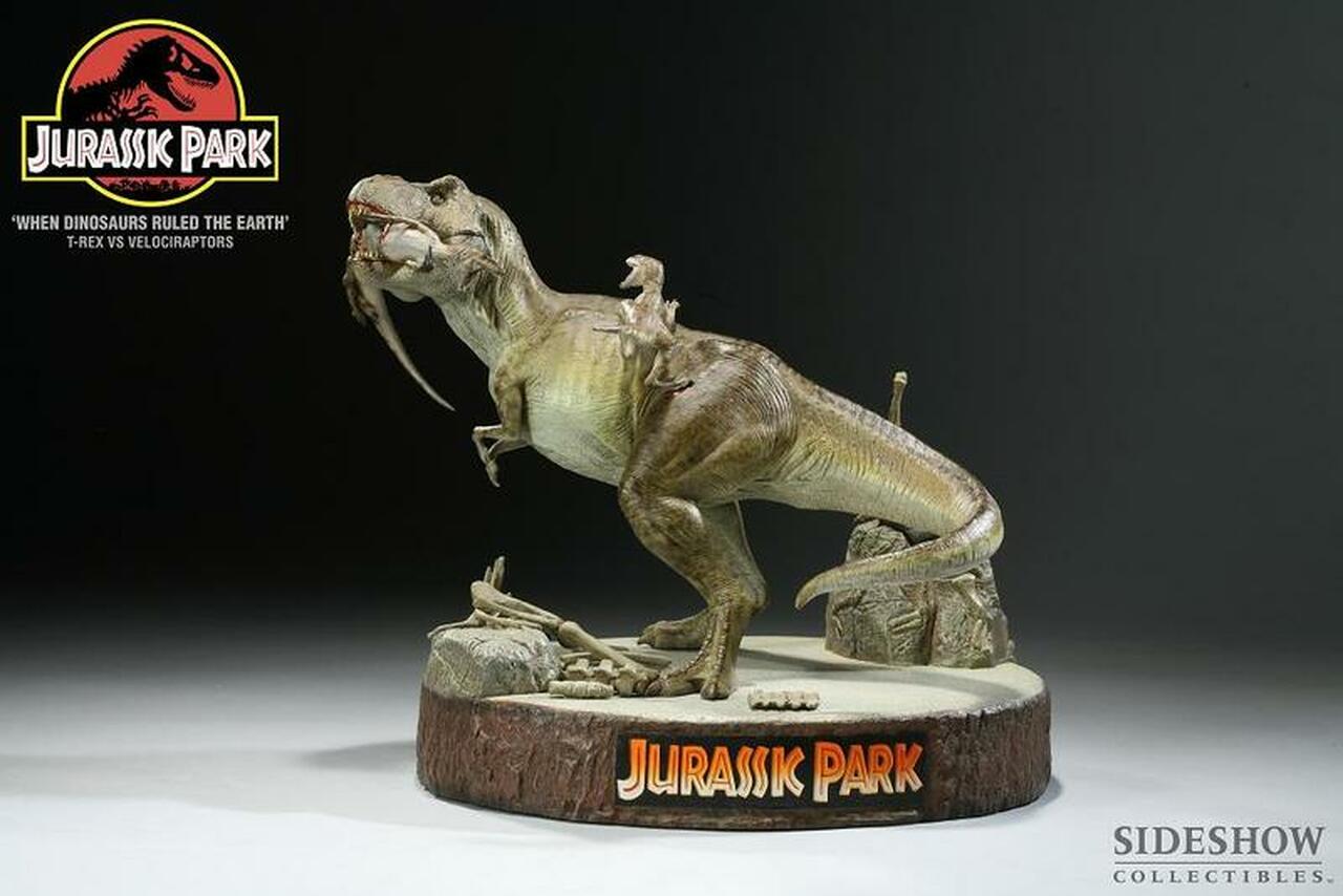 Sideshow Collectibles is proud to bring you the T-Rex VS Raptor diorama, launching the line of Jurassic Park collectibles. In this dynamic diorama, the prehistoric creatures clash in a visceral tear-down fight, perfectly capturing every detail of the final battle scene. Each piece is cast in high quality polystone, hand-finished, and hand-painted to exacting standards. The T-Rex VS Raptor Diorama is complete with a hand-numbered individual edition number on the bottom side of the base. Don’t miss this chance to own the premier piece in the Jurassic Park line of collectibles!