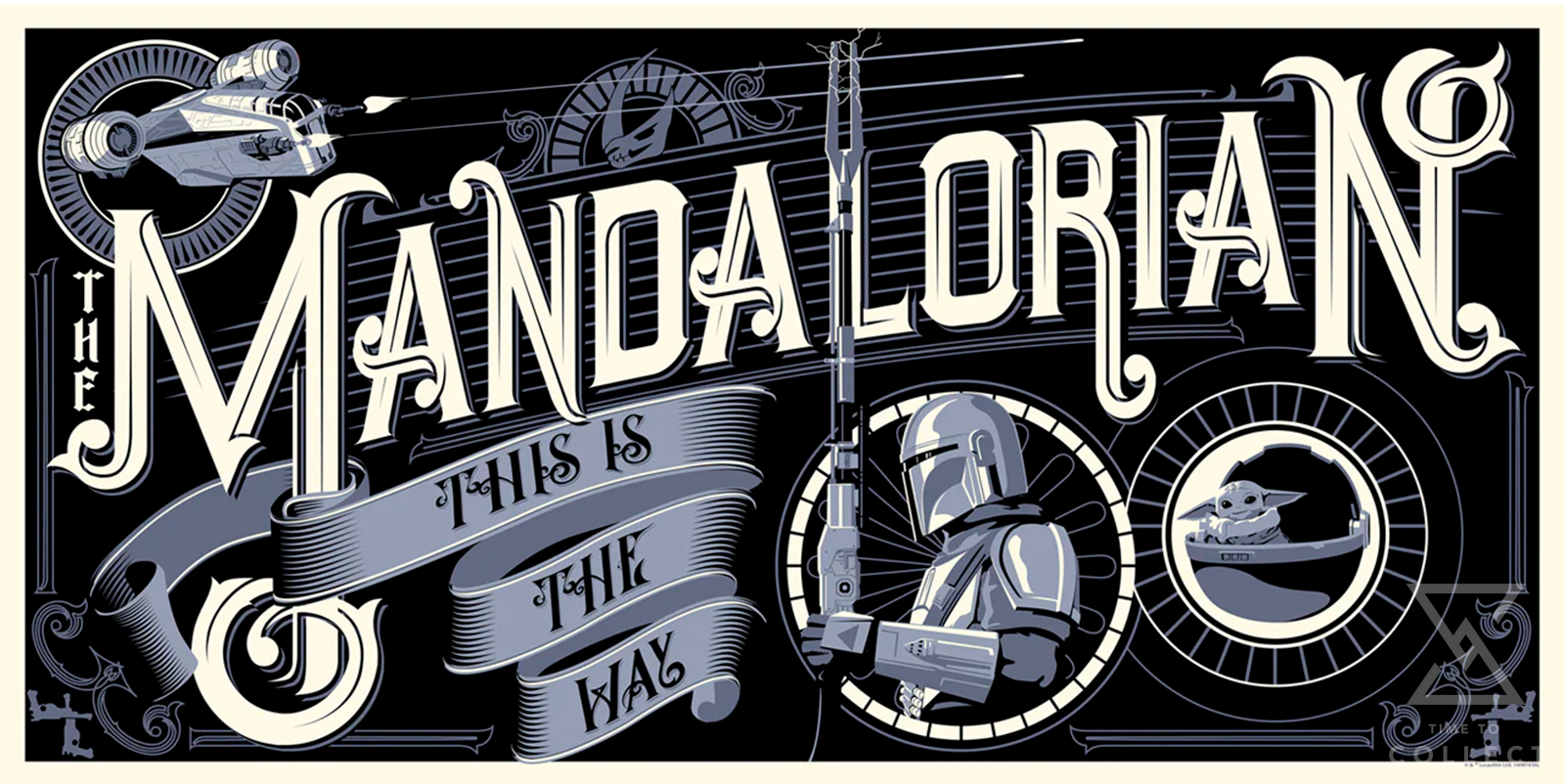 Presented in a signature vintage poster style, this Mandalorian art print features Din Djarin with Grogu in tow, ready for every intergalactic adventure (or conflict) their unique bond lands them in.