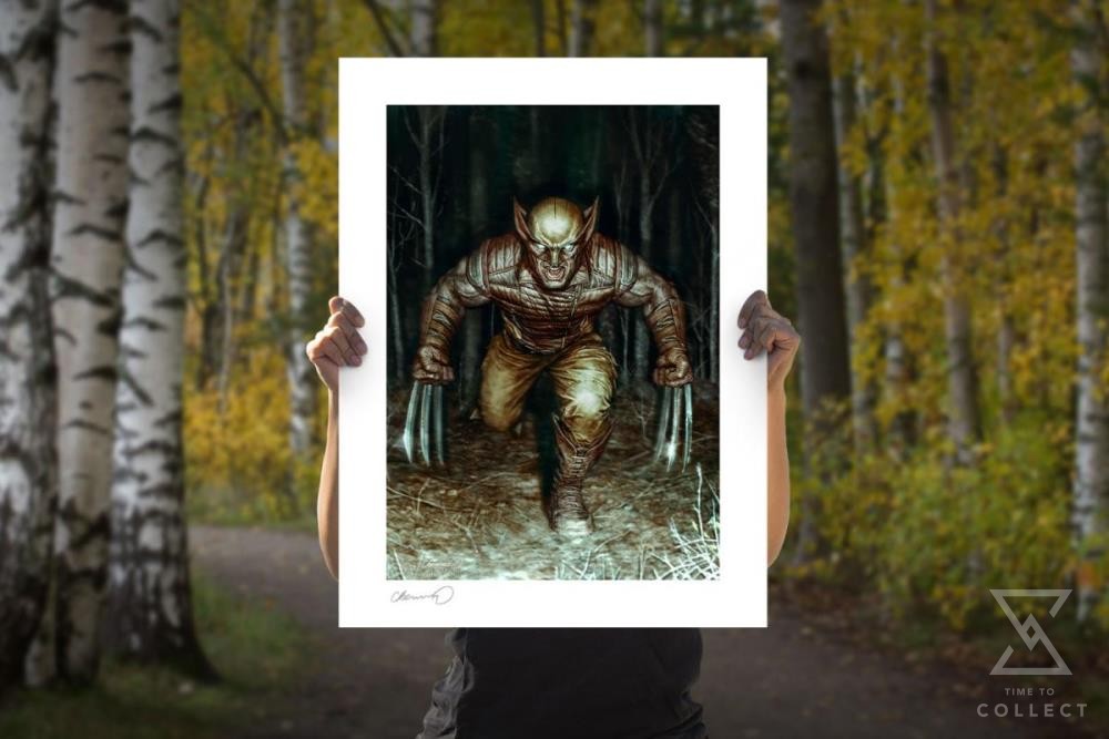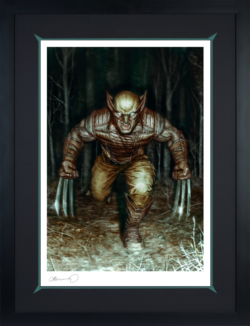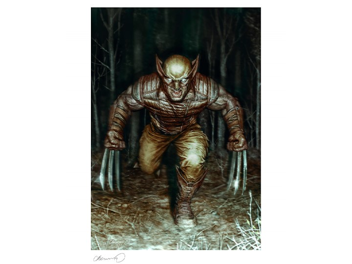 You never know what ferocious creatures roam the untamed wilderness! Created as an homage to a classic Marvel Comics promotional poster by Arthur Adams, this incredible illustration shows Wolverine in a savage state, running headlong at the viewer with his claws unleashed. Logan is dressed in a unique interpretation of his brown and yellow costume, snarling as he traverses a dark forest in the dead of night.