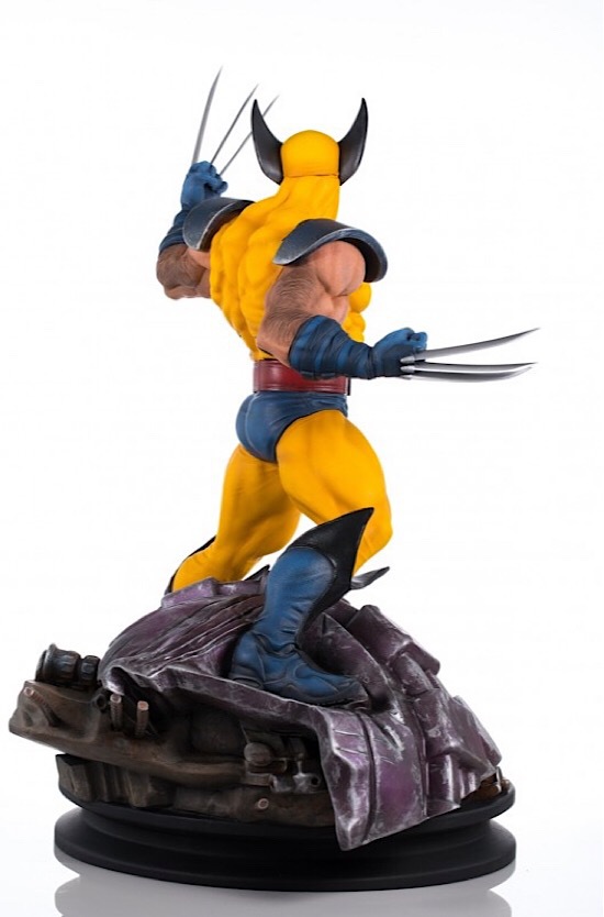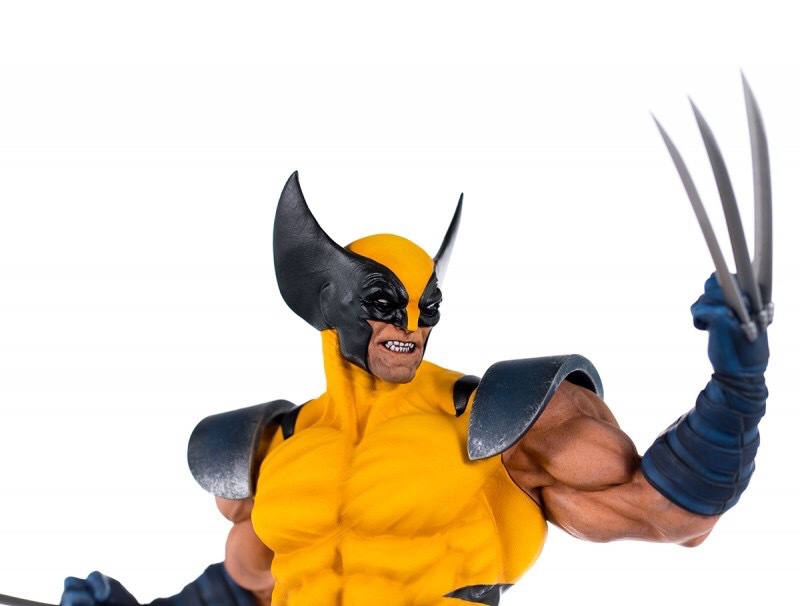 The gold and blue costume of Marvel’s mutants most glorious era shines on the shoulders of our Canadian berserker, complete with the X-Men insignia belt buckle and weathering from past battles. Chock-full of determination and Adamantium, Wolverine has unsheathed his metal claws ready to get back in his endless cycle of fighting. Clad in his textured costume his impressive musculature is highly rendered in details: sinews, veins hair exquisitely painted.
