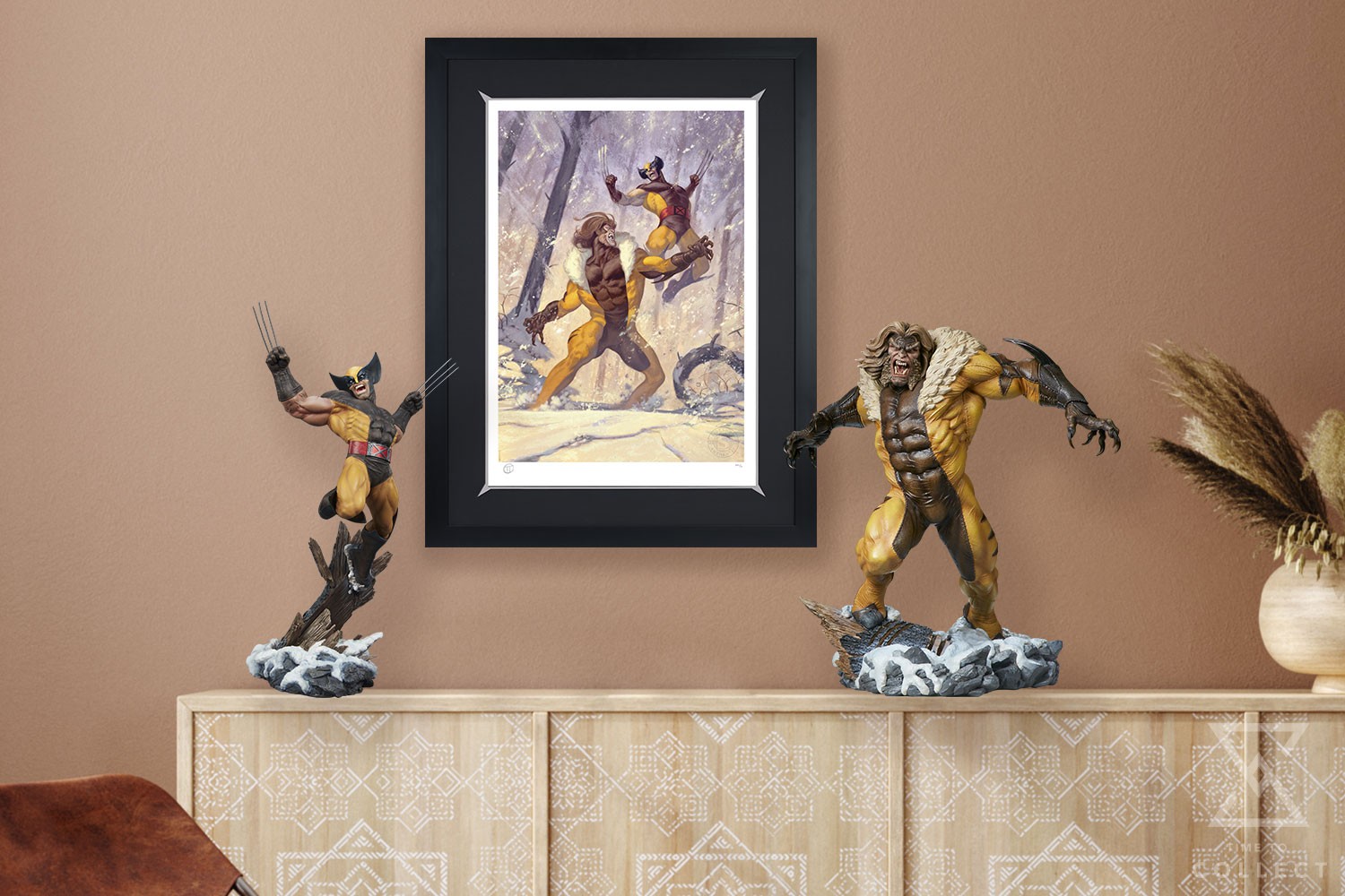 Each Wolverine vs Sabretooth Fine Art Print features an authorized, automated artist signature and an embossed Sideshow logo as part of the limited edition of 350 pieces. Inspired by the dynamic tableau achieved by pairing together the Wolverine and Sabretooth Premium Format™ Figures by Sideshow, this X-Men art is available as an unframed giclée and in a custom framed presentation to allow for different display options alongside the statues.